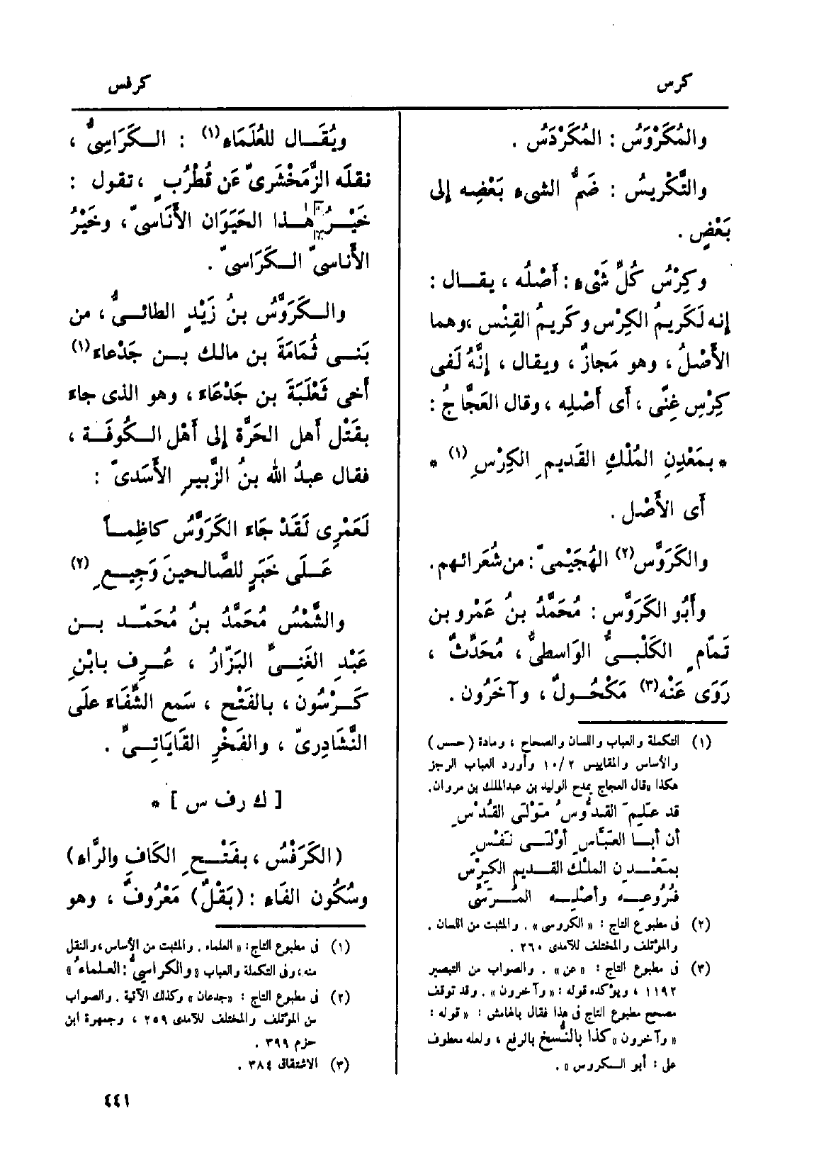 والمُكّرْوَسُ: المُكَرْدَسُ. والتَّكْريسُ: ضَمُّ الشيءِ بَعْضِه إِلى بَعْضٍ. وكِرْسُ كُلِّ شَيْءٍ: أَصْلُه، يُقَال: إِنه لَكَريمُ الكِرْس وكَريمُ القِنْس، وهما الأَصْلُ، وَهُوَ مَجازٌ، وَيُقَال، إِنَّهُ لَفي كِرْسِ غِنيً، أَي أَصْلِه، وَقَالَ العَجَّاجُ: بمَعْدِنِ المُلْكِ القَديمِ الكِرْسِ أَي الأَصْل. والكَرَوَّس الهُجَيْميّ: من شُعَرائهم. وأَبُو الكَرَوَّس: مُحَمَّدُ بنُ عَمْرو بن تَمّامٍ الكَلْبيُّ الوَاسطيُّ، مُحَدِّثٌ، رَوَى عَنْه مَكْحُولٌ، وآخَرُون. ويُقَال للعُلَمَاءِ: الكَرَاسِيُّ، نقَله الزَّمَخْشَريّ عَن قُطْرُبٍ، تَقول: خَيْرُ هَذَا الحَيَوَان الأَنَاسيّ، وخَيْرُ الأَناسيّ الكَرَاسيّ. والكَرَوَّسُ بنُ زَيْدٍ الطائيُّ، من بَني ثُمَامَةَ بن مَالك بن جَدْعاءَ أَخي ثَعْلَبَةَ بن جَدْعَاءَ، وَهُوَ الَّذِي جاءَ بقَتْل أَهل الحَرَّة إِلى أَهْل الكُوفَة، فَقَالَ عبدُ الله بن الزَّبيرِ الأَسَديّ: