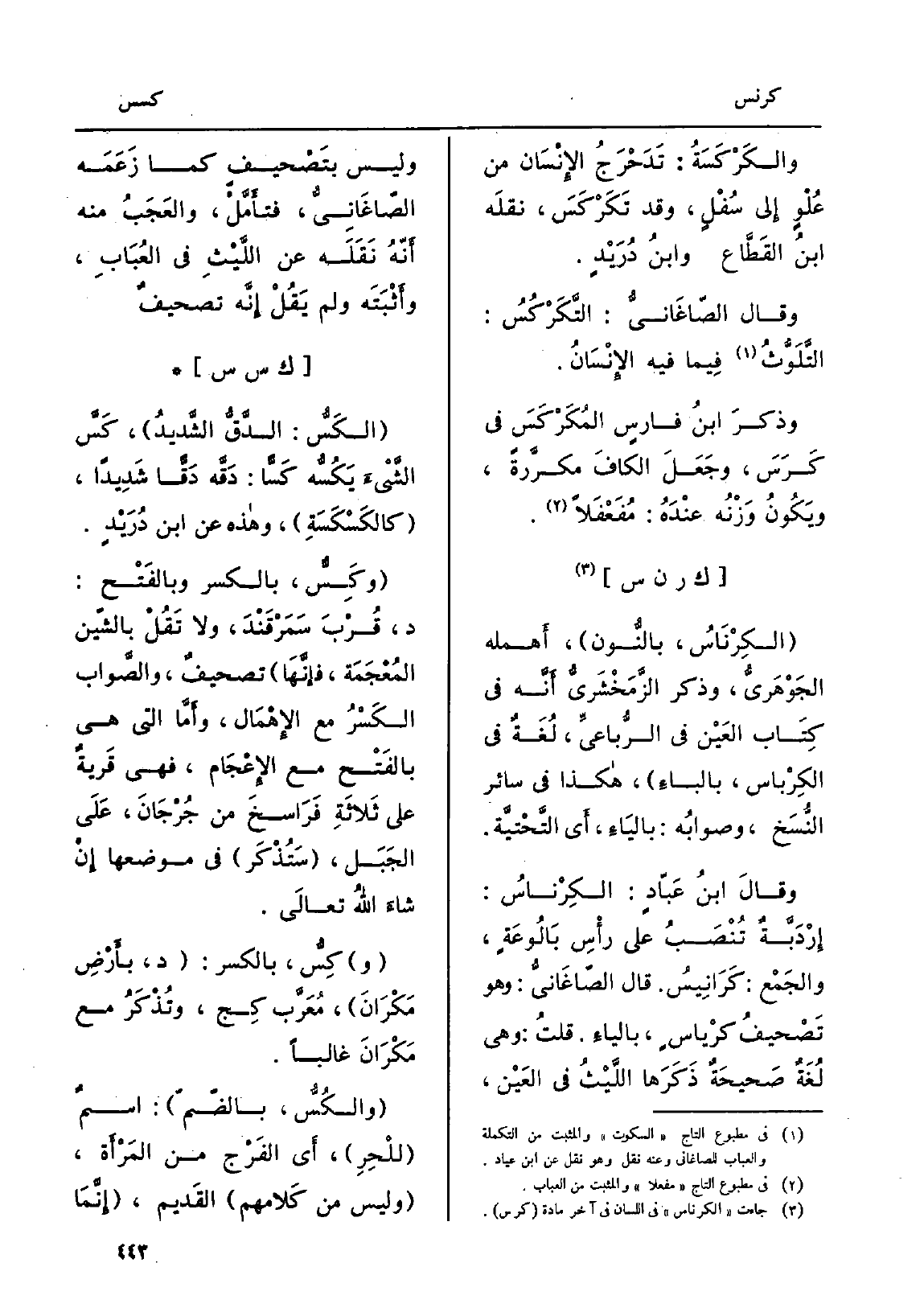 الكِرْنَاسُ، بالنُّون، أَهمله الجَوْهَريُّ، وَذكر الزَّمَخْشَريُّ أَنَّه فِي كِتَاب العَيْن فِي الرُّباعيُّ، لُغَةٌ فِي الكِرْباس، بالباءِ، هَكَذَا فِي سَائِر النُّسَخ، وصوابُه: باليَاءِ، أَي التَّحْتيَّة. وقالَ ابنُ عَبّادٍ: الكِرْناسُ: إِرْدَبَّةٌ تُنْصَبُ على رأْسِ بَالُوعَةٍ، والجَمْع: كَرَانِيسُ. قَالَ الصّاغَانيُّ: وَهُوَ تَصْحيفُ كرْياسٍ، بالياءِ. قلتُ: وَهِي لُغَةٌ صَحيحَةٌ ذَكَرَها اللَّيْثُ فِي العَيْن، وَلَيْسَ بتَصْحيفٍ كَمَا زَعَمَه الصّاغَانِيُّ، فتأَمَّلْ، والعَجَبُ مِنْهُ أَنّهُ نَقَلَه عَن اللَّيْثِ فِي العُبَابِ، وأَثْبَتَه وَلم يَقُلْ إِنَّه تصحيفٌ.