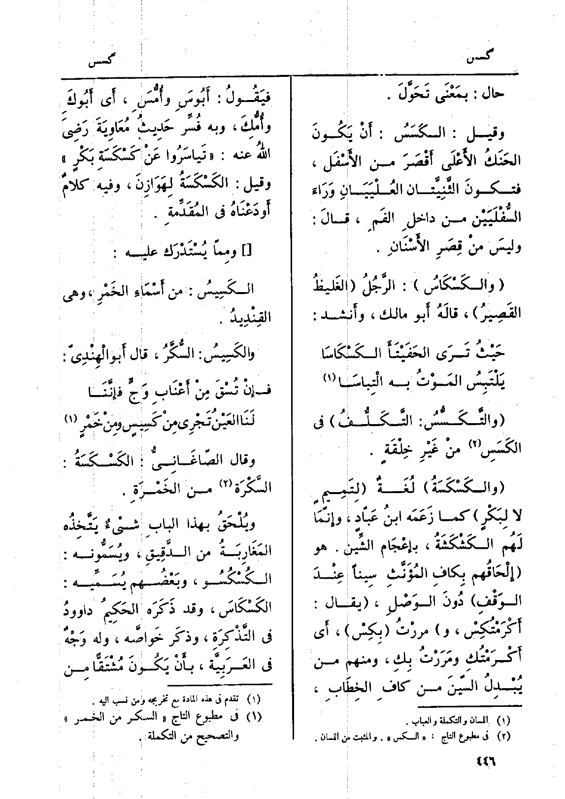حَال: بمَعْنَى تَحَوَّلَ. وَقيل: {الكَسَسُ: أَنْ يَكُونَ الحَنَكُ الأَعْلَى أَقْصَرَ من الأَسْفَل، فتكونَ الثَّنِيَّتان العُلْيَيَانِ وَرَاءَ السُّفْلَيَيْن من داخلِ الفَمِ، قالَ: وليسَ منْ قِصَرِ الأَسْنَانِ.} والكَسْكَاسُ: الرَّجُلُ الغَليظُ القَصِيرُ، قالَهُ أَبو مَالك، وأَنشد: