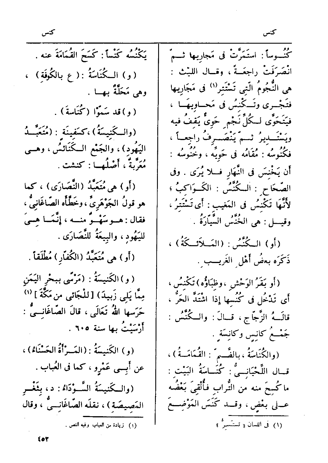 ُ كُنُوساً: إستَمَرَّتْ فِي مَجارِيها ثمّ إنْصَرَفَتْ راجعَةً، وَقَالَ الليْث: هِيَ النُّجُومُ الّتِي تَسْتَتِر فِي مَجَارِيها فتَجْري وتَكْنِسُ فِي مَحاوِيهَا، فيَتَحَوَّى لكُلِّ نَجْمِ حَوِيٌّ يَقِفُ فِيهِ ويِسْتَدِيرُ ثمّ يَنْصَرِفُ راجِعاً، فكُنُوسُه: مُقَامُه فِي حَوِيَّه، وخُنُوسُه: أَن يَخْنِسَ فِي النَّهَارِ فَلَا يُرَى. وَفِي الصّحَاحِ:)