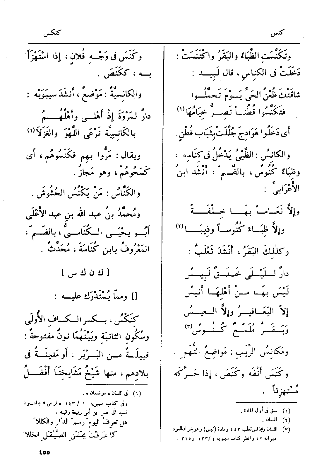 وكذلِكَ البَقَرُ، أَنْشَدَ ثَعْلَبٌ: دارٌ للَيْلَى خَلَقٌ لَبِيسُ لَيْسَ بهَا منْ أَهْلِهَا أَنيسُ إِلاّ اليَعَافيرُ وإِلاَّ العيسُ وَبَقَرٌ مُلَمّعٌ كُنُوسُ ومَكانِسُ الرَّيَبِ: مَواضِعُ التُّهَمْ. وكَنَسَ أَنْفَه وكَنَصَ، إِذا حَرَّكَه مُسْتهزِئاً. وكَنَسَ فِي وَجْهِ فُلانٍ، إِذا إسْتَهْزَأَ بِهِ، ككَنَصَ. والكانِسيَّةٌ: مَوْضعٌ، أَنشَدَ سيبَوَيْه: