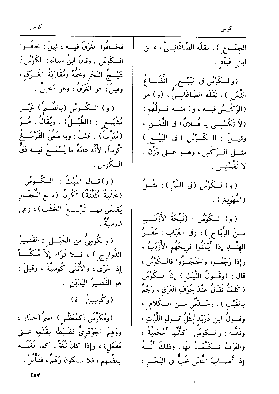 البَحْرِ وخَبُّهُ ومُقَارَبَةُ الغَرَقِ، وقيلَ: هُوَ الغَرَقُ، وَهُوَ دَخيلٌ. و} الكُوسُ بالضَّمِّ غَيْر مُشْبَعٍ: الطَّبْلُ، ويُقَالُ: هُوَ مُعَرَّبٌ. قلتُ: وَبِه سُمِّيَ الفَرْسَخُ {كُوساً، لأَنَّه غايَةُ مَا يُسْمَعُ فِيهِ دقُّ الكُوس. وَقَالَ اللَّيْثُ: الكُوسُ: خَشَبةٌ مُثَلَّثَةٌ تَكُونُ مَعَ النَّجَارِ يَقيسُ بهَا تَرْبيعَ الخَشَبِ، وَهِي فارسيَّةٌ.