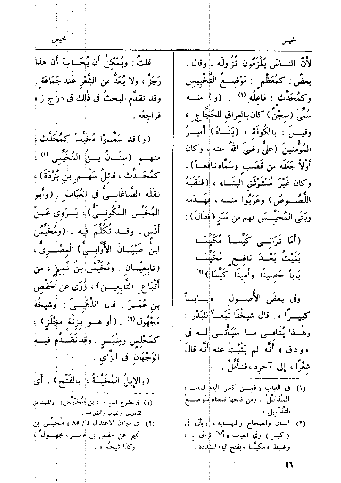 لأنَّ الناسَ يُلْزَمُون نُزُولَه. وَقَالَ. بعضٌ: كمُعَظَّمٍ: مَوْضِعُ {التَّخْيِيسِ وكمُحَدِّثٍ: فاعِلُه. وَمِنْه سُمِّيَ سِجْنٌ كَانَ بالعِراقِ للحَجَّاجِ، وقيلَ: بالكُوفَةِ، بنَاهُ أَميرُ المُؤْمنينَ عليٌّ رَضِي اللهُ عَنهُ، وَكَانَ أَوَّلاً جَعَلَه من قَصَبٍ وسَمَّاه نَافِعًا، وَكَانَ غَيْرَ مُسْتُوْثَقِ البنَاءِ، فنَقَبَهُ اللُّصُوصُ وهَرَبُوا مِنْهُ، فَهدَمه وبَنَى} المُخَيِّسَ لَهُم من مَدَرٍ فَقَالَ: أَمَا تَرَانِي كَيِّساً مُكَيِّسَا بَنَيْتُ بَعْدَ نافِعٍ {مُخَيِّسَا بَاباً حَصِيناً وأَمِيناً كَيِّسَا وَفِي بعض الأُصولِ: بَابا كَبِيرا. قَالَ شَيخُنَا تَبَعاً للبَدْر: وَهَذَا يُنَافِي مَا سَيَأْتِي لَهُ فِي ودق، أَنَّه لم يَثْبُتْ عَنهُ أَنَّه قالَ شِعْراً، إِلى آخِره، فتأَمَّلْ. قلتُ: ويُمْكِنُ أَن يُجَابَ أَن هَذَا رَجَزٌ، وَلَا يُعَدُّ من الشِّعْرِ عِنْد جَمَاعَةٍ. وَقد تقدَّم البحثُ فِي ذَلِك فِي ر ج ز فراجِعْه. وَقد سَمَّوْا} مُخَيِّساً كمُحَدِّث، مِنْهُم سِنَانُ بنُ {المُخَيِّسِ، كمُحَدِّث، قاتِلُ سَهْمِ بنِ بُرْدَةُ، نقَلَه الصَّاغَانِيُّ فِي العُبَابِ.