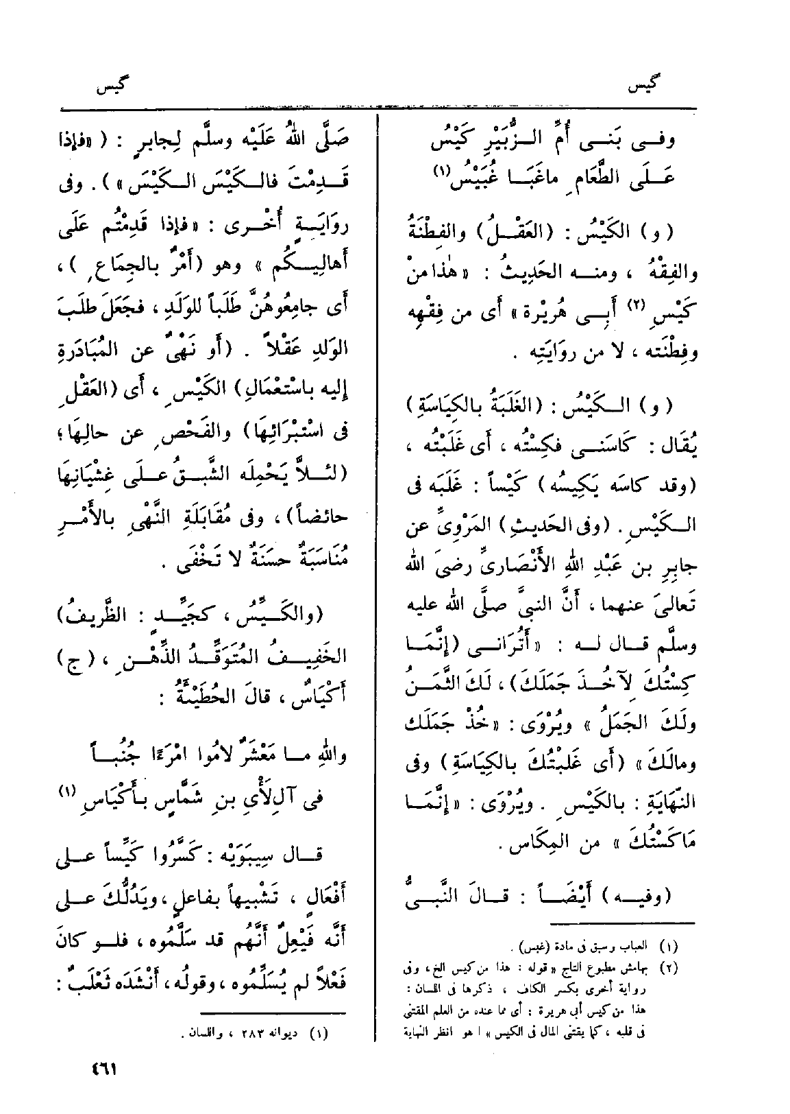 والكَيْسُ: العقْلُ والفِطْنَةُ والفِقْهُ، وَمِنْه الحَدِيِثُ: هَذَا منْ {كَيْسِ أَبِي هُرِيْرة أَي من فِقْهِه وفِطْنَته، لَا من روَايَتِه. والكَيْسُ: الغَلَبَةُ} بالكِيَاسةِ يُقَال: {- كَاسَني} فكِسْتُه، أَي غَلَبْتُه، وَقد {كاسَه} يَكيِسُه {كَيْساً: غَلَبَه فِي} الكَيْسِ. وَفِي الحَديِثِ المْرْوِيِّ عَن جابِرِ بن عَبْدِ اللهِ الأَنْصَاريَّ رضيَ الله تَعالَى عَنْهُمَا، أَنَّ النبيَّ صلَّى الله عَلَيْهِ وسلَّم وَقَالَ لَهُ: أَتُرَاني إِنَّمَا {كِسْتُكَ لآخُذَ جَمَلَكَ، لَكَ الثَّمَنُ ولَكَ الجَمَلُ ويُرْوَى: خُذْ جَمَلَك ومالَكَ أَي غَلبْتُكَ بالكِيَاسَةِ وَفِي النّهَايَةِ: بالكَيْسِ. ويُرْوَى إِنَّمَا مَا كَسْتُكَ من المِكَاس. وَفِيه أَيْضَاً: قالَ النَّبيُّ صَلَّى اللهُ عَلَيْه وسلَّم لِجابرٍ: فأِذا قَدِمْتَ} فالكَيْس {الكَيْسَ. وَفِي روَايَةٍ أُخْرى: فإِذا قَدِمْتُم عَلَى أَهالِيكُم وَهُوَ أَمْرٌ بالجِمَاعِ، أَي جامِعُوهُنَّ طَلَباً للوَلَدِ، فجَعَلَ طلَبَ الوَلدِ عَقْلاً. أَو نَهْيٌ عَن المُبَادَرةِ إِليه بإسْتعْمَالِ الكَيْسِ، أَي العَقْلِ فِي إسْتبْرَائِهَا والفَحْصِ عَن حالِهَا، لئلاَّ يَحْمِلَه الشَّبقُ علَى غِشْيَانِهَا حَائِضًا، وَفِي مُقَابَلَةِ النَّهْيِ بالأَمْرِ مُنَاسَبَةٌ حسَنةٌ لَا تخْفَى.} والكَيِّسُ، كجَيِّدٍ: الظَّريفُ الخَفِيفُ المُتَوَقِّدُ الذِّهْنِ، ج {أَكْيَاسٌ، قالَ الحُطَيْئَةُ: