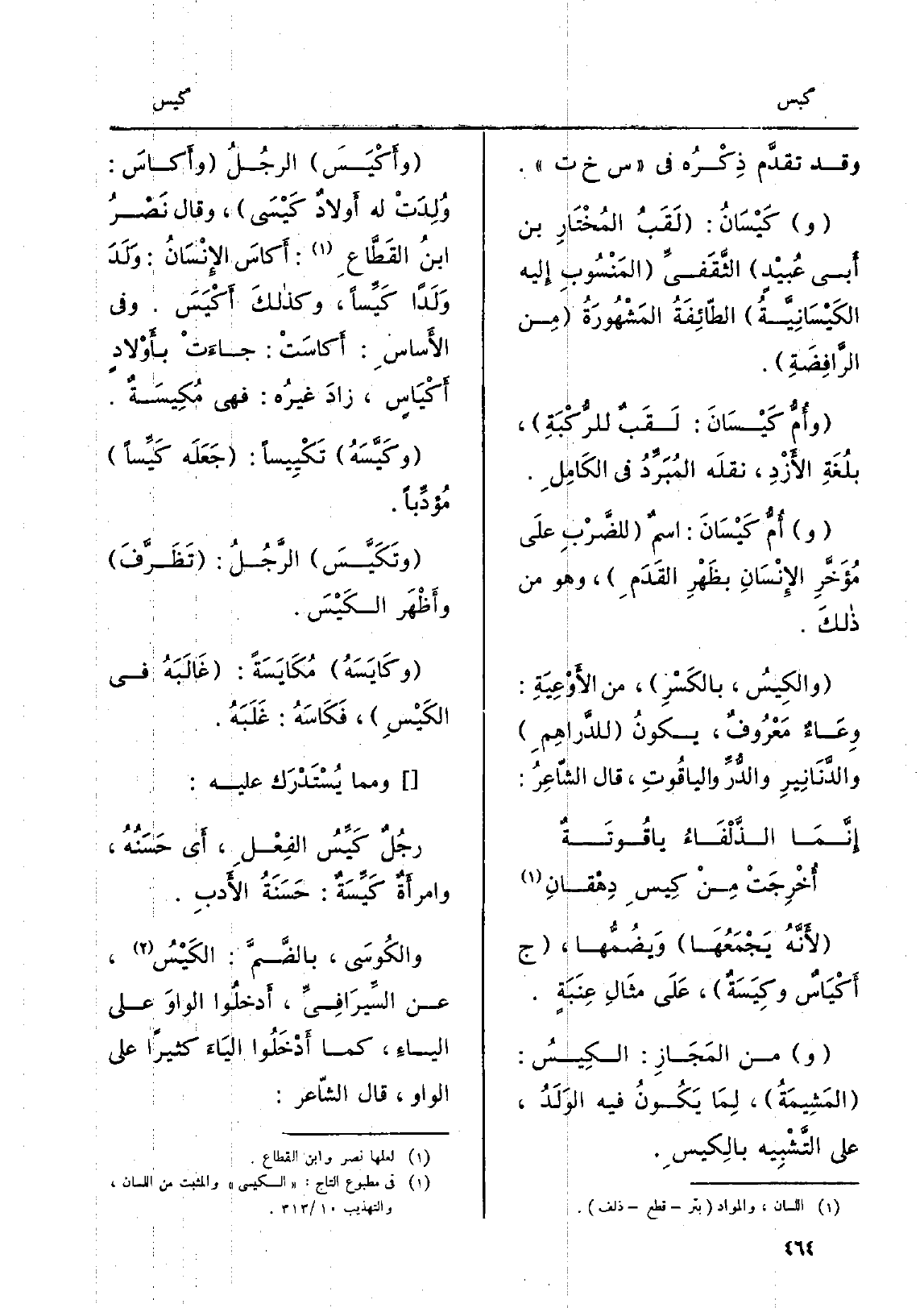 وَقد تقدَّم ذِكْرُه فِي س خَ ت. وكَيْسَانُ: لَقَبُ المُخْتَارِ بن أَبي عُبيْدٍ الثَّقَفيِّ المَنْسُوبِ إِليه {الكَيْسَانِيَّةُ الطّائِفَةُ المَشْهُورَةُ مِن الرَّافِضَةِ. وأُمُّ} كَيْسَانَ: لَقَبٌ للرُّكْبَةِ، بلُغَةِ الأَزْدِ، نقلَه المُبَرِّدُ فِي الكَامِلِ. وأُمُّ كَيْسَانَ: اسمُ للضَّرْبِ عَلى مُؤَخَّرِ الإِنْسَانِ بظَهْرِ القَدَمِ، وَهُوَ من ذلكَ. {والكِيسُ، بالكَسْرِ، من الأَوْعِيَةِ: وِعَاءٌ) مَعْرُوفٌ، يكونُ للدَّراهِمِ والدَّنَانِيرِ والدُّرِّ والياقُوتِ، قَالَ الشّاعِرُ: