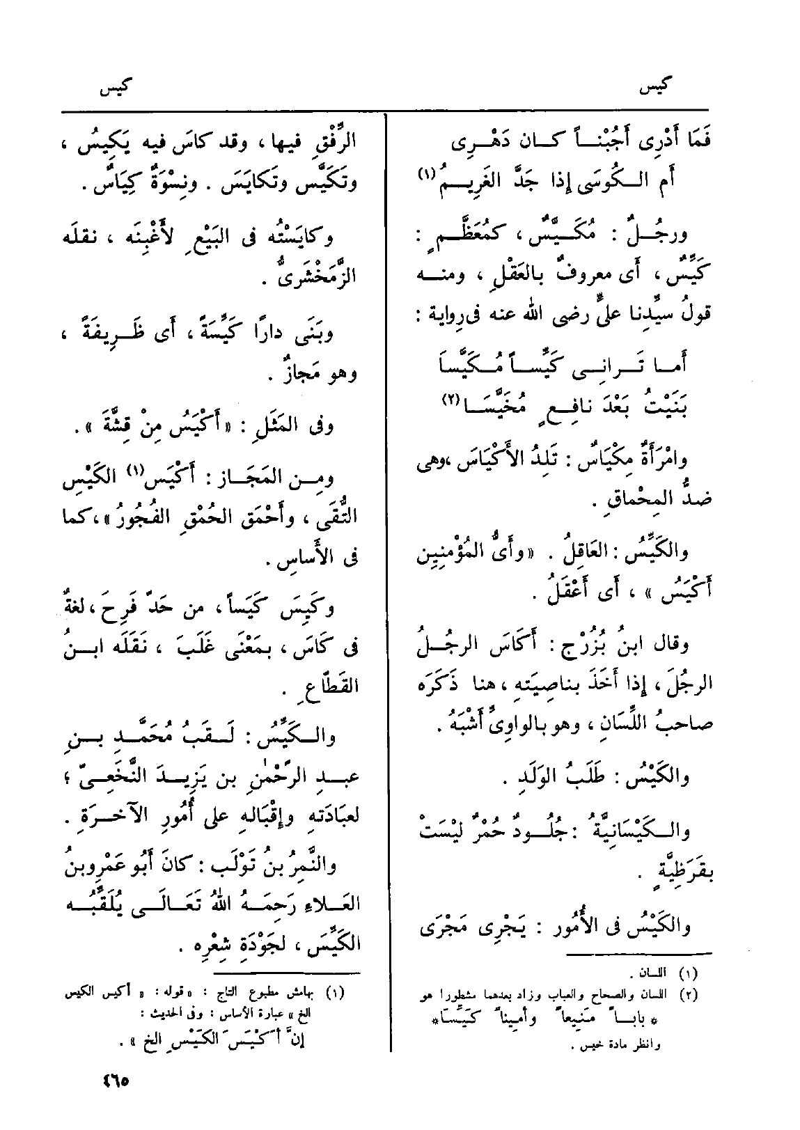 } وكايَسْتُه فِي البَيْعِ لأَغْبِنَه، نقلَه الزَّمَخْشَريُّ. وبَنَى دَارا {كَيِّسَةً، أَي ظَرِيفَةً، وَهُوَ مَجازٌ. وَفِي المَثَلِ:} أَكْيَسُ مِنْ قِشَّةَ. ومِن المَجَاز: أَكْيَس الكَيْسِ التُّقَي، وأَحْمَق الحُمْقِ الفُجُورُ، كَمَا فِي الأَساسِ. {وكَيِسَ} كَيَساً، من حَدّ فَرِحَ، لغةٌ فِي كَاسَ، بمَعْنَى غَلَبَ، نَقَلَه ابنُ القَطّاعِ. {والكَيِّسُ: لَقَبُ مُحَمَّدِ بنِ عبدِ الرّحْمَنِ بن يَزِيدَ النَّخَعِيّ، لعبَادَتهِ وإِقْبَالِه على أُمُورِ الآخرَةِ. والنَّمِرُ بنُ تَوْلَب: كانَ أَبُو عَمْرِو بنُ العَلاءِ رَحِمَهُ اللهُ تَعَالَى يُلَقِّبُه} الكَيِّسَ، لجَوْدَةِ شِعْرِه.