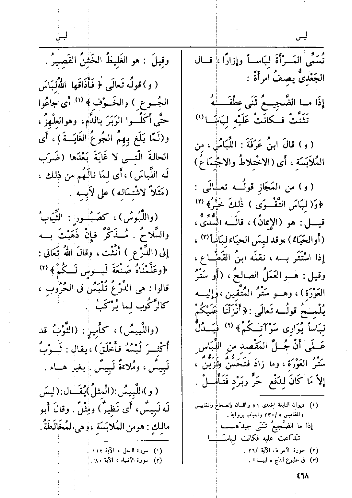 وقالَ ابنُ عَرَفَةَ: اللِّبَاسُ، مِن المُلاَبَسَةِ، أَي الإخْتِلاطُ والإجْتِمَاعُ وَمن المَجَازِ قولُه تعالَى: وَلِبَاسَ التَّقوَى ذلِكَ خَيْرٌ قيل: هُوَ الإِيمانُ، قالَه السُّدِّيُّ، أَو الحَيَاءُ، وَقد لبِسَ الحيَاءَ لِبَاساً، إِذا إسْتَتَر بِهِ، نقلَه ابنُ القَطّاع، وَقيل: هُوَ العَمَلُ الصالحُ، أَو سَتْرُ العَوْرَةِ، وَهُوَ سَتْرُ المُتَّقِين، وإِليه يُلْمِحُ قولُه تَعالَى: أَنْزَلْنَا عَلَيْكُمْ لِبَاساً يُوَارِي سَوْآتِكُمْ فيَدُلُّ عَلَى أَنّ جُلَّ المَقْصِدِ منِ اللِّبَاسِ سَتْرُ العَوْرَةِ، وَمَا زادَ فتَحَسُّنٌ وتَزَيُّنٌ، إِلاّ مَا كَانَ لِدَفْع حَرٍّ وبَرْدٍ فَتَأَملْ. وقِيلَ: هُوَ الغَلِيظُ الخَشِنُ القَصيرُ. وقولُه تَعالَى فَأَذَاقَها اللهُ لِبَاسَ الجُوعِ والخَوْفِ أَي جاعُوا حتَّى أَكَلُوا الوَبَرَ بالدَّم، وَهُوَ العِلْهِزُ، ولَمّا بَلَغ بِهِمُ الجُوعُ الغَايَةَ، أَي الحالَة الّتِي لَا غَايَةَ بَعْدَها ضَرَب لَه اللِّباسَ، أَي لِمَا نالَهُم من ذَلك، مَثَلاً لإشْتِمَالِه على لاَبِسِه. واللَّبُوسُ، كصَبُورٍ: الثِّيَابُ والسِّلاحُ. مُذَكَّرٌ فإِنْ ذَهَبْتَ بِهِ إِلى الدِّرْعِ أَنَّثْت، وقالَ اللهُ تَعَالى: وعَلَّمْنَاهُ صَنْعَةَ لَبوسٍ لَكُمْ قَالُوا: هِيَ الدِّرْعُ تُلْبَسُ فِي الحُرُوبِ، كالرَّكُوب لِما يُرْكَبُ. واللَّبيسُ، كأَمِيرٍ: الثَّوْبُ قد أُكْثِرَ لُبْسُهُ فأَخْلَقَ، يُقَال: ثَوْبٌ لَبِيسٌ، ومُلاءَةٌ لَبِيسٌ. بِغَيْر هَاء. واللَّبِيسُ: الْمِثلُ يُقَال: ليسَ لَه لَبِيسٌ، أَي نَظِيرٌ ومِثْلٌ. وَقَالَ أَبو مالِكٍ: هُوَ من المُلابَسَةِ، وَهِي المُخَالَطَةُ.