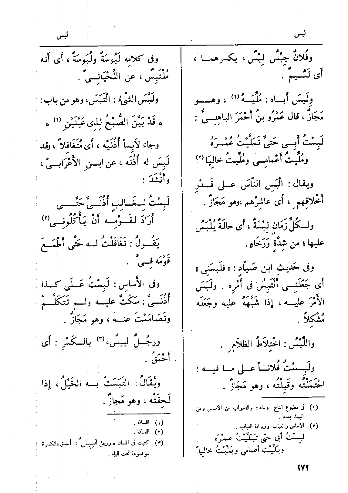 وَيُقَال: ألْبَسِ النّاسَ على قَدْرِ أَخْلاقِهمِ، أَي عاشِرْهم، وَهُوَ مَجَازٌ. ولكُلِّ زَمَانٍ لِبْسَةٌ، أَي حالَةٌ يُلْبَسُ عَلَيْهَا، من شِدَّةٍ وَرَخَاءٍ. وَفِي حَديثِ ابْن صَيّادٍ: فلَبسَنِي أَي جَعَلَنِي أَلْتَبِسُ فِي أَمْرِه. ولَبَسَ الأَمْرَ عَلَيْهِ، إِذا شَبَّهَهُ عَلَيْهِ وجَعَلَه مُشْكِلاً. واللَّبْسُ: إخْتِلاَطُ الظلاَمِ. ولَبِسْتُ فُلاناً على مَا فِيهِ: إحْتَمَلْتُه وقَبِلْتُه، وَهُوَ مَجَازٌ. وَفِي كلامِه لَبُوسَةٌ ولُبُوسَةٌ، أَي أَنه مُلْتَبِسٌ، عَن اللِّحْيَانِيّ. ولَبَّسَ الشْيءُ: إلْتَبَسَ، وَهُوَ من بَاب: قَدْ بَيَّنَ الصُّبْحُ لِذِي عَيْنَيْنِ وجاءَ لاَبِساً أُذُنَيْه، أَي مُتَغَافِلاً، وَقد لَبِسَ لَهُ أُذُنَه، عَن ابنِ الأَعْرَابيّ، وأَنْشَدَ: