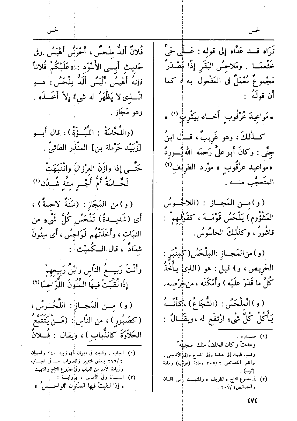 َ تَرَاه قد عَدَّاه إِلى قولِه: عَلَى حَيِّ خَثْعمَا. ومَلاحِسُ البَقَرِ إِذاً مَصْدَرٌ مَجْموعٌ مُعْملٌ فِي المَفْعول بِهِ، كَمَا أَن قولَهُ: مَواعِيدَ عُرْقُوبٍ أَخاه بيَثْرِبِ كذلكَ، وَهُوَ غَرِيبٌ، قَالَ ابنُ جِنِّى: وكانَ أَبو عليٍّ رَحمَه الله يُورِدُ مواعيد عرْقُوبٍ موْرد الطرِيفِ المتَعجَّب مِنْهُ. ومِن المَجاز: اللاحُوسُ المَشْؤُوم يلْحَسُ قَوْمَهَ، كقَوْلِهِمْ: قاشُورٌ، وكذلِكَ الحاسُوسُ. وَمن المَجازِ: المِلْحَسُ كمِنْبَرٍ: الحَرِيص، وَقيل: هُوَ الذِي يأْخُذُ كُلَّ مَا قَدَرَ علَيْه وأَمْكَنَه، من حِرْصِه. والْمِلْحَسُ: الشُّجَاعُ، كأَنَّهُ يَأْكُلُ كُلَّ شْيءٍ إرْتفَع لَهُ، ويقَالُ: فُلانٌ أَلدُّ مِلْحسٌ، أَحْوَسُ أَهْيَسُ وَفِي حَدِيثِ أَبِي الأَسْوَدِ: عَلَيْكُمْ فُلاناً فإِنهُ أَهْيسُ أَلْيَسُ أَلَدُّ مِلْحَسُ هُوَ الّذِي لَا يَظْهَرُ لَهُ شيءٌ إِلاّ أَخَذَه. وَهُوَ مَجَاز. واللَّحَّاسَةُ: اللَّبُؤَةُ، قَالَ أَبو زُبيْد حَرمْلة بن المنْذر الطائيّ.