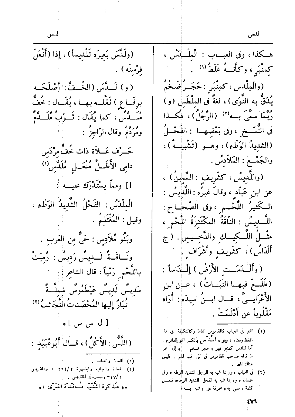والْمِلْدس، كمِنْبَرٍ: حَجَرٌ ضَخْمٌ يُدَقُّ بِهِ النَّوَى، لغةٌ فِي المِلْطَسِ ورُبَّمَا سمِّيَ بِهِ الرَّجُلُ، هَكَذَا فِي النُّسَخِ، وَفِي بَعْضَها: الفَحْلُ الشدِيدُ الوَطْءِ، وَهُوَ تَشْبيهٌ، والجَمْع: المَلاَدِسُ. واللَّدِيسُ، كشَرِيفٍ: السَّمينُ، عَن ابنِ عَبّادٍ، وقالَ غيرُه: اللَّدِيسُ: الكَثيرُ اللَّحْمِ، وَفِي الصّحاح: اللَّدِيسُ: النّاقَةُ المكْتَنِزَةُ اللَّحْمِ، مثْلُ اللَّكِيكِ والدَّخِيسِ. ج أَلْدَاسٌ، كشَريفٍ وأَشْرَافٍ. وأَلْدَسَتِ الأَرْضُ إِلْدَاساً: طَلَعَ فِيهَا النَبَاتُ، عَن ابنِ الأَعْرَابيِّ، قَالَ ابنُ سِيدَه: أُرَاه مَقْلُوباً عَن أَدْلَسَتْ. ولَدَّسَ بَعِيرَه تَلْدِيساً، إِذا أَنْعَلَ فِرْسِنَه. ولَدَّسَ الخُفَّ: أَصْلَحَه برِقَاعٍ ثَقَّله بهَا، يُقَال: خُفُّ مُلَدَّسٌ، كَمَا يُقَال: ثَوْبٌ مُلَدَّمٌ ومُرَدَّمٌ وَقَالَ الرّاجِزُ: حَرْف عَلاَة ذَات خُفٍّ مِرْدَسِ دامِي الأَظَلِّ مُنْعَلٍ مُلَدَّسٍ وممّا يسْتَدْرَك عَلَيْهِ: الْمِلْدَسُ: الفَحْلُ الشَّدِيدُ الوَطْءِ، وَقيل: المُغْتَلِمُ. وبَنُو مُلاَدِسٍ: حَيٌّ مِن العَربِ. ونَاقَةٌ لَدِيسٌ رَدِيسٌ: رُمِيَتْ باللَّحْمِ رَمْياً، قَالَ الشاعِر: