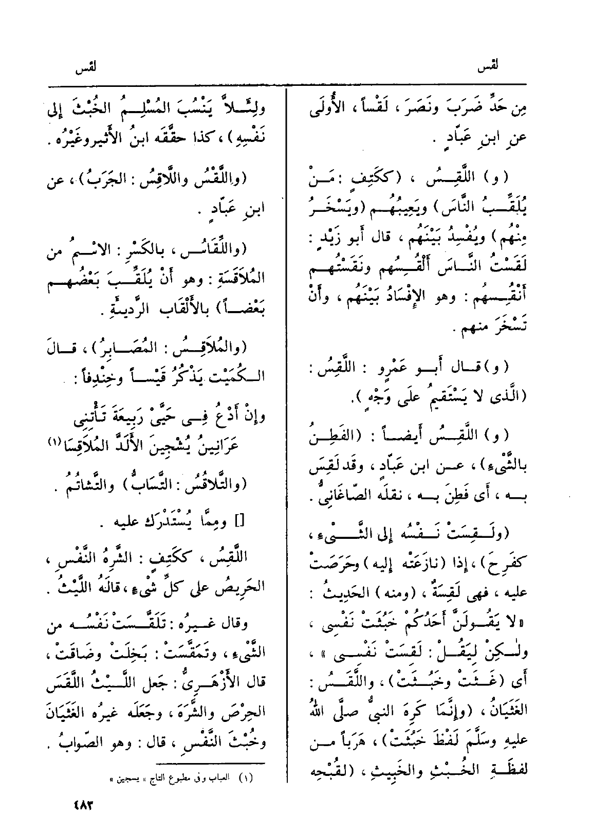 والتَّلاقُسُ: التَّسَابُّ والتَّشاتُمُ. ومِمَّا يُسْتَدْرَك عَلَيْهِ. اللَّقِسُ، ككَتِفٍ: الشَّرِهُ النَّفْسِ، الحَرِيصُ على كلِّ شيْءٍ، قالَهُ اللَّيْثُ. وَقَالَ غيرُه: تَلَقَّسَتْ نَفْسُه من الشَّيْءِ، وتَمَقَّسَتْ: بَخِلَتْ وضَاقَتْ، قَالَ الأَزْهَرِيُّ: جَعل اللَّيْثُ اللَّقَسَ الحِرْصَ والشَّرَهَ، وجَعَلَه غيرُه الغَثَيَانَ وخُبْثَ النَّفْسِ، قَالَ: وَهُوَ الصّوابُ.