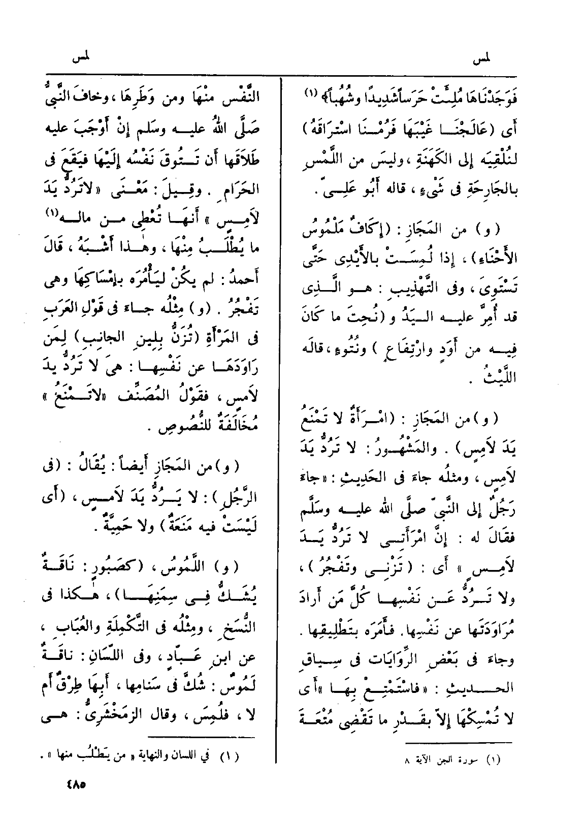 فَوَجَدْنَاهَا مُلِئَتْ حَرَساً شَدِيداً وشُهُباً أَي عَالَجْنَا غَيْبَهَا فَرُمْنَا إسْتَراقَهُ لنُلْقِيَه إِلى الكَهَنَةِ، وليسَ من اللَّمْسِ بالجَارِحَةِ فِي شَيْءٍ، قَالَه أَبُو عَلِيّ. وَمن المَجَازِ: إِكَافٌ مَلْمُوسُ الأَحْنَاءِ، إِذا لُمِسَتْ بالأَيْدِي حَتَّى تَسْتَوِيَ، وَفِي التَّهْذِيبِ: هُوَ الَّذِي قد أُمِرَّ عَلَيْهِ اليَدُ ونُحِتَ مَا كَانَ فِيه من أَوَدٍ وإرْتِفَاعٍ ونُتُؤءٍ، قالَه اللَّيْثُ. وَمن المَجَازِ: امْرَأَةٌ لَا تَمْنَعُ يَدَ لاَمِسٍ. والمَشْهُورُ: لَا تَرُدُّ يَدَ لاَمِسٍ، ومثلُه جاءَ فِي الحَدِيثِ: جاءَ رَجُلٌ إِلى النَّبيّ صلَّى الله عَلَيْهِ وسَلَّم فقَالَ لَهُ: إِنَّ امْرَأَتِي لَا تَرُدُّ يَدَ لاَمِسٍ أَي تَزْنِي وتَفْجُرُ، وَلَا تَرُدُّ عَن نَفْسِها كُلَّ مَن أَرادَ مُرَاوَدَتَها عَن نَفْسِها. فأَمَرَه بتَطْلِيقِها.