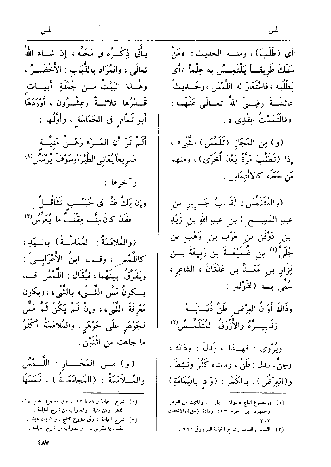 أَي طَلَبَ، وَمِنْه الحَدِيث: مَنْ سَلَكَ طَرِيقاً يَلْتَمِسُ بِهِ عِلْماً أَي يَطْلُبه، فإسْتَعَارَ لَهُ اللَّمْسَ، وحَديثُ عائشَةَ رضِيَ اللهُ تعالَى عَنْهَا: فإلْتَمَسَتُ عِقْدِي. ومِن المَجَازِ تَلَمَّسَ الشَّيْءَ، إِذا تَطَلَّبَ مَرَّةً بَعْدَ أُخْرَى، وَمِنْهُم مَن جَعَلَه كالإلْتِمَاسِ. والمُتَلَمِّسُ: لَقَبُ جَرِيرِ بنِ عبدِ المَسِيحِ بنِ عبدِ اللهِ بنِ زَيْدِ ابنِ دَوْفَن بنِ حَرْب بنِ وَهْبِ بن جُلَيِّ بنِ ضُبَيْعَةَ بن رَبِيعَةَ بن نِزَارِ بنٍ مَعَدِّ بن عَدْنَانَ، الشاعِرِ، سُمَّي بِهِ لقَوْلهِ: