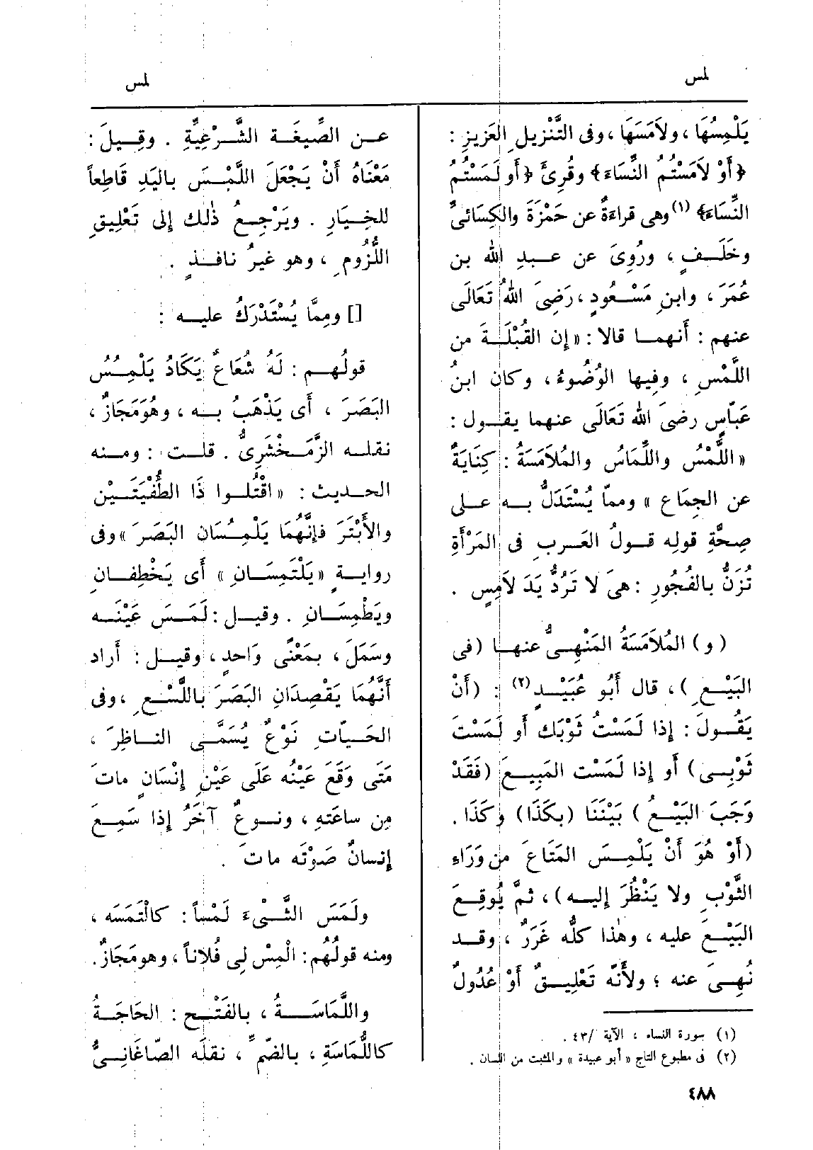يَلْمِسُهَا، ولاَمَسَهَا، وَفِي التَّنْزيلِ العَزيزِ: أَوْ لاَمَسْتُمُ النِّسَاءَ وقُرِئَ أَو لَمَسْتُمُ النِّسَاءَ وَهِي قراءَةُ عَن حَمْزَةَ والكِسَائيِّ وخَلَفٍ، ورُوِيَ عَن عبدِ الله بن عُمَرَ، وابنِ مَسْعُودٍ، رَضِيَ اللهُ تَعَالَى عَنْهُم: أَنهما قَالَا: إِن القُبْلَةَ من اللَّمْسِ، وفِيها الوُضُوءُ، وَكَانَ ابنُ عَبّاسٍ رضيَ الله تَعَالَى عَنْهُمَا يَقُول: اللَّمْسُ واللِّمَاسُ والمُلاَمَسَةُ: كِنَايَةٌ عَن الجِمَاع وممّا يُسْتَدَلُّ بِهِ على صِحَّةِ قولِه قولُ العَربِ فِي المَرْأَةِ تُزَنُّ بالفُجُورِ: هِيَ لَا تَرُدُّ يَدَ لاَمِسٍ. والمُلاَمَسَةُ المَنْهِيُّ عَنْهَا فِي البَيْعِ، قَالَ أَبُو عُبَيْدٍ: أَنْ يَقُولَ: إِذا لَمَسْتُ ثَوْبَك أَو لَمَسْتَ ثَوْبِي أَو إِذا لَمَسْت المَبِيعَ فَقَدْ وَجَبَ البَيْعُ بَيْنَنَا بكَذَا وكَذَا. أَوْ هُوَ أَنْ يَلْمِسَ المَتَاعَ من وَرَاءِ الثَّوْبِ وَلَا يَنْظُرَ إِليه، ثمَّ يُوقِعَ البَيْعَ عَلَيْهِ، وَهَذَا كلُّه غَرَرٌ، وَقد نُهِيَ عَنهُ، ولأَنّه تَعْلِيقٌ أَوْ عُدُولٌ عَن الصِّيغَة الشَّرْعِيِّةِ. وقِيلَ: مَعْنَاهُ أَنْ يَجْعَلَ اللَّمْسَ باليَدِ قَاطِعاً للخِيَارِ. ويَرْجِعُ ذَلِك إِلى تَعْلِيقِ اللُّزُومِ، وَهُوَ غيرُ نافذٍ. ومِمَّا يُسْتَدْرَكُ عَلَيْهِ: قولُهم: لَهُ شُعَاعٌ يَكَادُ يَلْمِسُ البَصَرَ، أَي يَذْهَبُ بِهِ، وهُوَ مَجَازٌ، نَقله الزَّمَخْشَرِيُّ. قلت: وَمِنْه الحَدِيث: إقْتُلوا ذَا الطُئفْيَتَيْن والأَبْتَرَ فإِنَّهُمَا يَلْمِسَان البَصَرَ وَفِي روايةٍ يَلْتَمِسَانِ أَي يَخْطِفانِ ويَطْمِسَانِ.