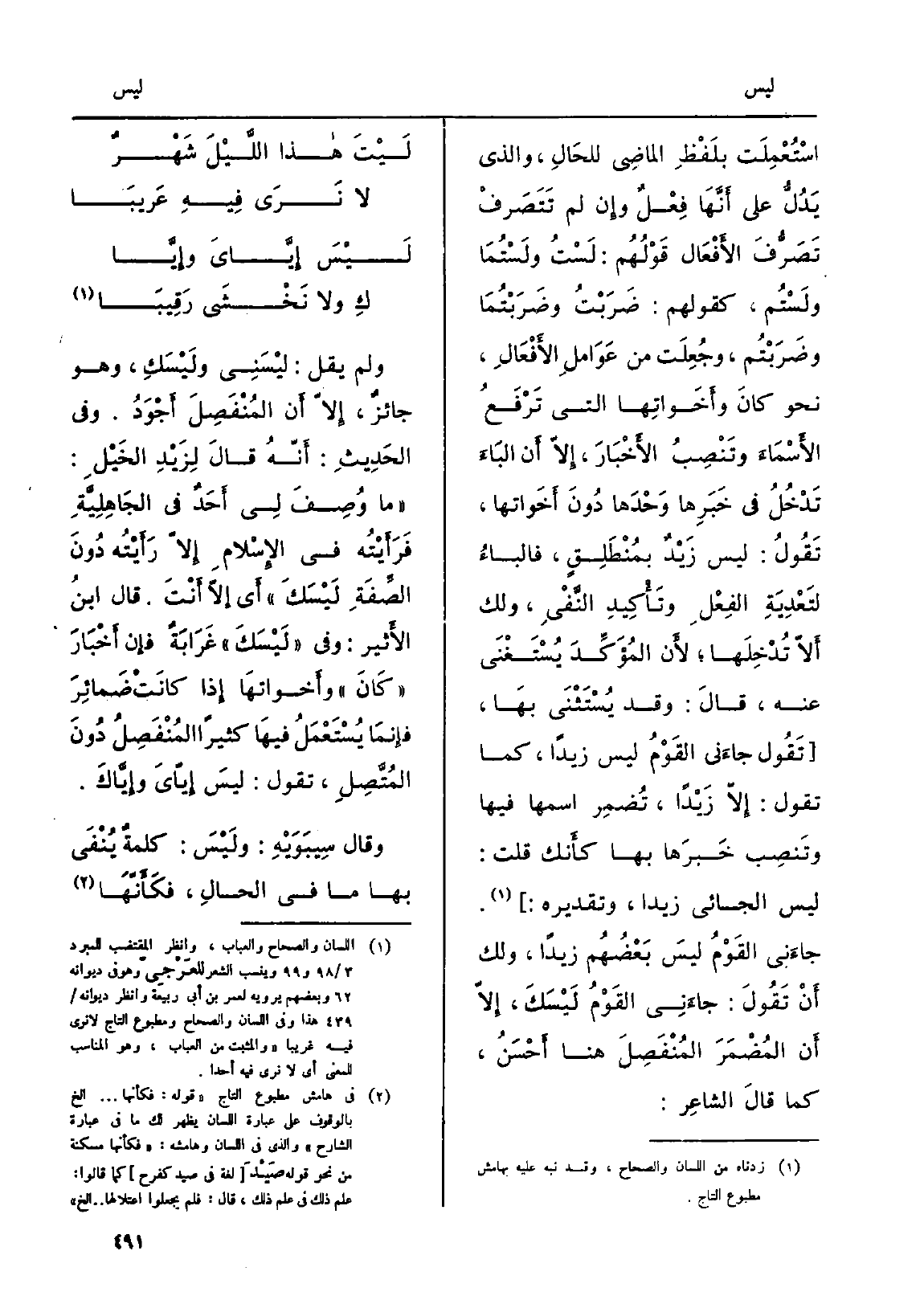 إسْتُعْمِلَت بلَفْظِ الماضِي للحَالِ، وَالَّذِي يَدُلُّ على أَنَّهَا فِعْلٌ وإِن لم تَتَصَرفْ تَصَرُّفَ الأَفْعَال قَوْلُهُم: {لَسْتُ} ولَسْتُمَا {ولَسْتُم، كَقَوْلِهِم: ضَرَبْتُ وضَرَبْتُمَا وضَرَبْتُم، وجُعِلَت من عَوَاملِ الأَفْعَالِ، نَحْو كانَ وأَخَواتِها الَّتِي تَرْفَعُ الأَسْمَاءَ وتَنْصِبُ الأَخْبَارَ، إِلاّ أَن البَاءَ تَدْخُلُ فِي خَبَرِها وَحْدَها دُونَ أَخَواتها، تَقُولُ: لَيْسَ زَيْدٌ بمُنْطَلِقٍ، فالباءُ لتَعْدِيَةِ الفِعْلِ وتَأْكِيدِ النَّفْيِ، وَلَك أَلاّ تُدْخِلَها، لأَن المُؤَكِّدَ يُسْتَغْنَى عَنهُ، قالَ: وَقد يُسْتَثْنَى بهَا، تَقُول جاءَني القَوْمُ لَيْسَ زيدا، كَمَا تَقول: إِلاّ زَيْداً، تُضمِر اسْمهَا فِيهَا وتَنصِب خَبرَها بهَا كأَنك قلت: لَيْسَ الجائي زيدا، وَتَقْدِيره: جاءَني القَوْمُ ليسَ بَعْضُهُم زيدا، وَلَك أَنْ تَقُولَ: جاءَنِي القَوْمُ لَيْسَكَ، إِلاّ أَن المُضْمَرَ المُنْفَصِلَ هُنَا أَحْسَنُ، كَمَا قالَ الشاعِر:
