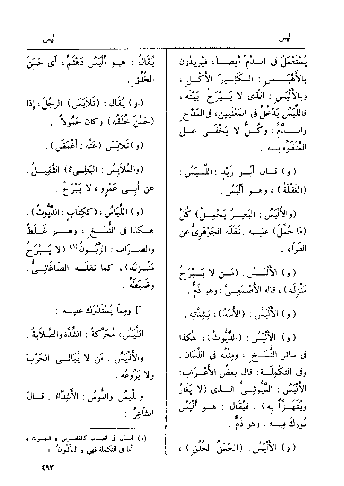 } والأَلْيَسُ: مَن لَا يُبَالي الحَرْبَ وَلَا يَرُوعُه.! واللِّيسُ واللُّوسُ: الأَشِدَّاءُ. قالَ الشّاعِرُ: