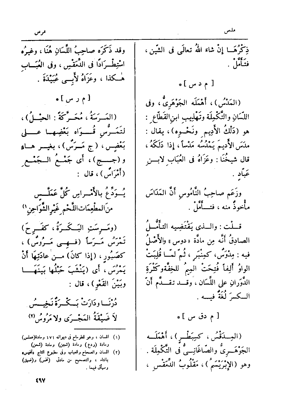 المَدْسُ، أَهْمَلَه الجَوْهَرِيُّ، وَفِي اللّسَانِ والتَّكْمِلَة وتَهْذِيبِ ابنِ القَطّاعِ: هُوَ دَلْكُ الأَدِيمِ ونَحْوِه، يُقَال: مدَسَ الأَديمَ يَمْدُسُه مَدْساً، إِذا دَلَكَهُ، قَالَ شيخُنَا: وعَزَاهُ فِي العُبَابِ لابنِ عَبّادٍ. وزَعَم صاحِبُ النَّامُوسِ أَنَّ المَدَاسَ مأْخوذٌ مِنْهُ، فتأَمَّلْ. قلْت: وَالَّذِي يَقْتَضِيه التأَمُّلُ الصادِقُ أَنَّه مِن مادَّة دوس والأَصْلُ فِيهِ: مِدْوَسٌ، كمِنْبَرٍ، ثُمّ لمّا قُلِبَتْ الواوُ أَلِفاً فُتِحَتْ المِيمُ للخِفَّة وكَثْرَةِ الدَّوَرانِ على اللِّسَان، وَقد تقدَّم أَنّ الكسرَ لُغَةٌ فِيهِ.