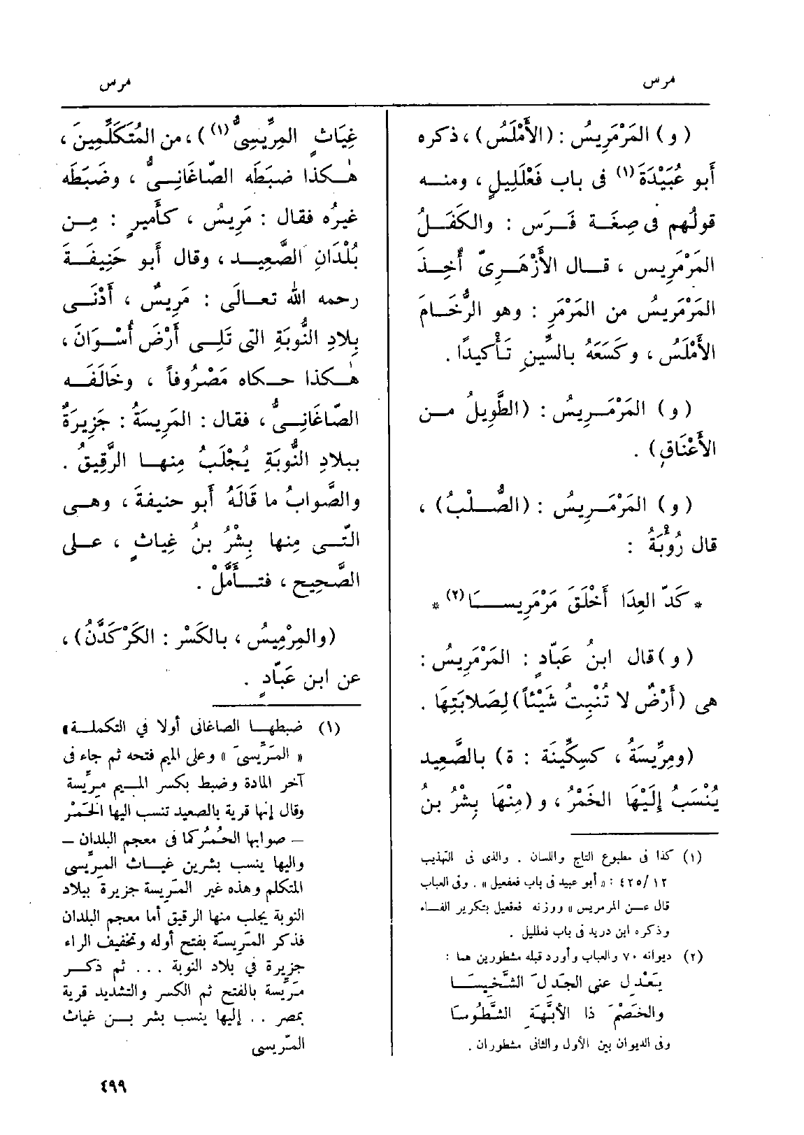والمَرْمَرِيسُ: الصُّلْبُ، قَالَ رُؤْبَةُ: كَدّ العِدَا أَخْلَقَ مَرْمَرِيساً وَقَالَ ابنُ عَبّادٍ: المَرْمَرِيسُ: هِيَ أَرْضٌ لَا تُنْبِتُ شَيْئاً لِصَلابَتِهَا. ومِرِّيسَةُ، كسِكِّينَة: ة بالصَّعِيد يُنْسَبُ إِلَيْهَا الخَمْرُ، ومِنْهَا بِشْرُ بنُ غِيَاثٍ المِرِّيسِيُّ، من المُتَكَلِّمِينَ، هَكَذَا ضبَطَه الصّاغَانِيُّ، وضَبَطَه غيرُه فَقَالَ: مَرِيسُ، كأَميرٍ: مِن بُلْدَانِ الصَّعِيد، وَقَالَ أَبو حَنِيفَةَ رَحمَه الله تعالَى: مَرِيسٌ، أَدْنَى بِلادِ النُّوبَةِ الَّتِي تَلِي أَرْضَ أُسْوَانَ، هَكَذَا حَكَاهُ مَصْرُوفاً، وخَالَفَه الصّاغَانِيُّ، فَقَالَ: المَرِيسَةُ: جَزِيرَةٌ ببلادِ النُّوبَةِ يُجْلَبُ مِنها الرَّقِيقُ. والصَّوابُ مَا قَالَهُ أَبو حنيفةَ، وَهِي الّتي مِنها بِشْرُ بنُ غِياثٍ، على الصَّحِيح، فتأَمَّلْ. والمِرْمِيسُ، بالكَسْر: الكَرْكَدَّنُ، عَن ابنِ عَبّادٍ.