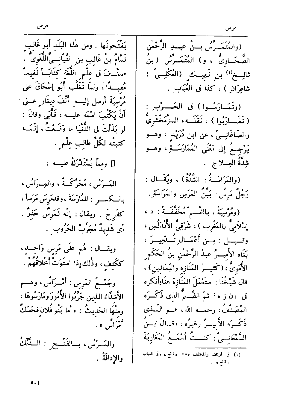والمُتَمَرِّسُ بنُ عبدِ الرَّحْمَن الصُّحَارِيُّ، والمُتَمَرِّسُ بنُ ثالِخ بنِ نَهِيكٍ العُكْلِيّ: شاعِرَانِ، كَذَا فِي العُبَاب. وتَمَارَسُوا فِي الحَرْبِ: تَضَارَبُوا، نَقَلَه، الزَّمَخْشَرِيُّ والصّاغَانِيّ، عَن ابْن دُرَيْدٍ، وَهُوَ يَرْجِعُ إِلى مَعْنَى المُمَارَسَةِ، وَهُوَ شِدَّةُ العِلاج. والمَرَاسَةُ: الشَّدَّةُ، ويُقَال: رَجُلٌ مَرِسٌ: بَيِّنٌ المَرَسِ والمَرَاسَةِ. ومُرْسِيَةُ، بالضَّمّ مُخَفَّفَةً: د، إِسْلاَمِيُّ بالمَغْرِب، شَرْقِيَّ الأَنْدَلُسِ، وَقيل: مِن أَعْمَالِ تُدْمِيرَ، بَنَاه الأَمِيرُ عبدُ الرَّحْمنِ بنُ الحَكَمِ الأُمَوِيُّ، كَثِيرُ المَنَازِهِ والبَسَاتِينِ، قَالَ شَيْخُنَا: إستَعْمَلَ المَنَازِهَ هنَا وأَنكره فِي ن ز هـ، ثمّ الضَّمُّ الذِي ذَكَرَه المُصَنّفُ، رَحمَه الله، هُوَ الّذِي ذَكَرَه الأَمِيرُ وغيرُه، وقالَ ابنُ السَّمْعَانِيّ: كنتُ أَسْمَعُ المَغَارِبَةَ يَفْتَحونَها. وَمن هَذَا البَلَدِ أَبو غَالِبٍ تَمَّامُ بنُ غَالِبِ بنِ التَّيّانِيِّ اللُّغَوِيُّ، صنَّفَ فِي عِلْمِ اللُّغَةِ كِتَابَاً نَفِيساً مُفِيداً، ولمّا تغَلَّب أَبُو إِسْحَاقَ على مُرْسِيَةَ أَرسل إِليهِ أَلْفَ دِينَارٍ على أَنْ يَكْتُبَ اسْمَه عَلَيْهِ، فَأَبَى وقالَ: لَو بَذَلْتَ لي الدُّنْيَا مَا وَضَعْتُ، إِنّمَا كتبتُه لكُلِّ طالِبِ عِلْمٍ. ومِمّا يُسْتَدْرَكُ عَلَيْهِ: المَرَسُ، مُحَرِّكَةً، والمِرَاسُ، بالكسرِ: الممُارَسَةُ، وَقد مَرِسَ مَرَساً، كفَرِحَ. وَيُقَال: إِنّه لَمَرِسٌ حَذِرٌ. أِي شَدِيدٌ مُجَرِّبُ الحُرُوبِ. وَيُقَال: هُم علَى مَرِسٍ وَاحِدٍ، ككَتِفٍ، وَذَلِكَ إِذا إستَوتَ أَخْلاقُهُمْ. وجَمْعُ المَرِسِ: أَمْرَاسٌ، وهم الأَشِدَّاءُ الذِين جَرَّبُوا الأُمُورَ ومَارَسُوهَا، ومِنْهَا الحَدِيثُ: أَما بَنُو فُلانٍ فحَسَكٌ أَمْرَاسٌ. والمَرْسُ، بالفَتْحِ: الدَّلْكُ والإِدافَةُ.