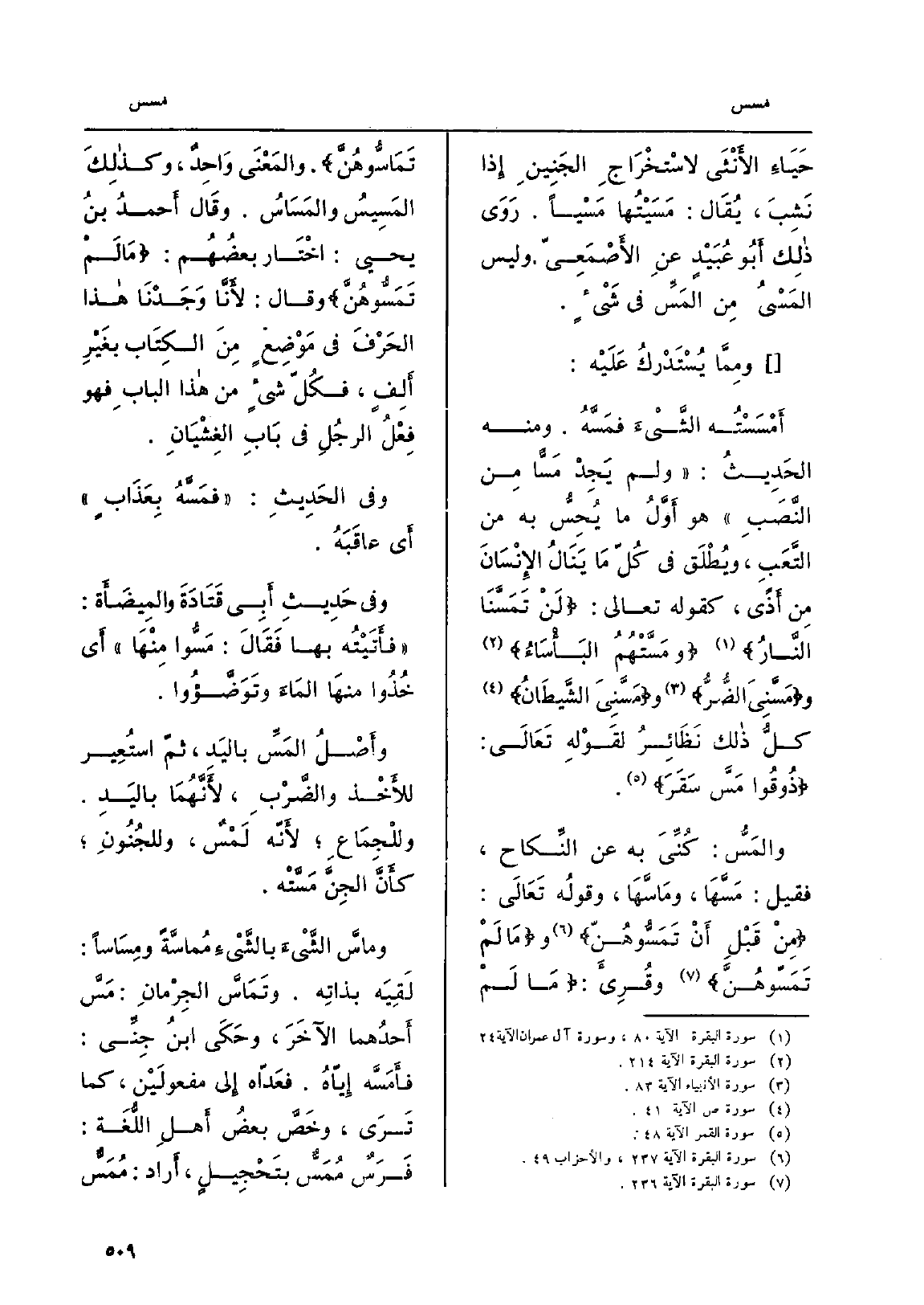 حَيَاءِ الأَنْثَى لإسْتخْرَاجِ الجَنِين إِذا نَشِبَ، يُقَال: مَسَيْتُها مَسْياً. رَوَى ذلِك أَبُو عُبَيْدٍ عنِ الأْصْمَعِيّ، وَلَيْسَ المَسْيُ مِن المَسِّ فِي شَيْءٍ. ومِمَّا) يُسْتَدْركُ عَلَيْه: {أَمْسَسْتُه الشَّيْءَ} فمَسَّهُ. وَمِنْه الحَدِيثُ: وَلم يَجِدْ {مَسّاً مِن النَّصَبِ، هُوَ أَوَّلُ مَا يُحِسُّ بِهِ من التَّعَبِ، ويُطْلَق فِي كُلّ مَا يَنَالُ الإِنْسَانَ مِن أَذىً، كَقَوْلِه تَعَالَى: لَنْ} تَمَسَّنَا النَّارُ {ومَسَّتْهُمُ البَأْسَاءُ و (} - مَسَّنِيَ الضُّرُّ و ( {- مَسَّنِيَ الشَّيطَانُ كلُّ ذَلِك نَظَائِرُ لقَوْلِه تَعَالَى: ذُوقُوا} مَسَّ سَقَرَ. {والمَسُّ: كُنِّيَ بِهِ عَن النِّكاح، فَقيل:} مَسَّهَا، {ومَاسَّهَا، وقولُه تَعَالَى: مِنْ قَبْلِ أَنْ} تَمَسُّوهُنّ ومَا لَمْ تَمَسّوهُنَّ وقُرِئَ: مَا لَمْ {تَمَاسُّوهُنَّ. والمَعْنَى وَاحِدٌ، وكذلِكَ} المَسِيسُ {والمَسَاسُ. وقَال أَحمدُ بنُ يحيى: إخْتَار بعضُهُم: مَا لَمْ} تَمَسُّوهُنَّ وَقَالَ: لأَنَّا وَجَدْنَا هَذَا الحَرْفَ فِي مَوْضِعٍ مِنَ الكِتَاب بغَيْرِ أَلِفٍ، فكُلّ شيءٍ من هَذَا البابِ فَهُوَ فِعْلُ الرجُلِ فِي بَابِ الغِشْيَانِ. وَفِي الحَدِيثِ: {فمَسَّهُ بِعَذَابٍ، أَي عاقَبَهُ. وَفِي حَدِيث أِبِي قَتَادَةَ والمِيضَأَة: فأَتَيْتُه بهَا فَقَالَ:} مَسُّوا مِنْهَا، أَي خُذُوا مِنْهَا المَاءَ وتَوَضَّؤُوا. وأَصْلُ {المَسِّ باليَدِ، ثمّ إستُعِير للأَخْذ والضَّرْبِ، لأَنَّهُمَا باليَدِ. وللْجِمَاعِ، لأَنّه لَمْسٌ، وللجُنُونِ، كأَنَّ الجِنَّ مَسَّتْه.} ومَاسَّ الشَّيْءَ بالشَّيْءِ {مُماسَّةً} ومِسَاساً: لَقِيَه بذاتِه.