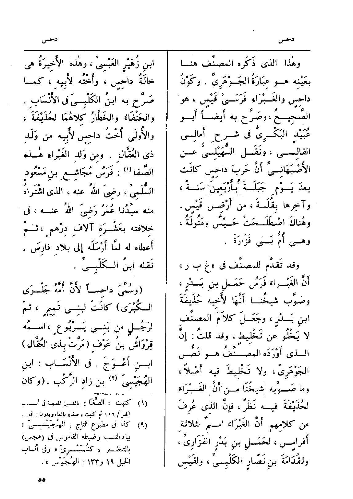 وَهَذَا الَّذِي ذَكَره المصنِّف هُنَا بعَيْنِه هُوَ عِبَارَةُ الجُوْهَرِيِّ. وكَوْنُ داحِسٍ والغَبْرَاءِ فَرَسَيْ قَيْسٍ، هُوَ الصَّحِيحُ، وصَرَّح بِهِ أَيضاً أَبو عُبَيْدٍ البَكْرِيُّ فِي شرحِ أَمالِي القالِي، ونَقَل السُّهَيْلِيُّ عَن الأَصْبَهَانِيِّ أَنَّ حَربَ داحِسٍ كانَت بعدَ يَوْمِ جَبَلَةَ بأَرْبَعِينَ سَنةً، وآخِرها بِقُلَهَ، من أَرْضِ قَيْسٍ. وهُناكَ اصْطَلَحَتْ حَيْسٌ ومَنُولَةُ، وَهِي أُمُّ بَني فَزَارَةَ.