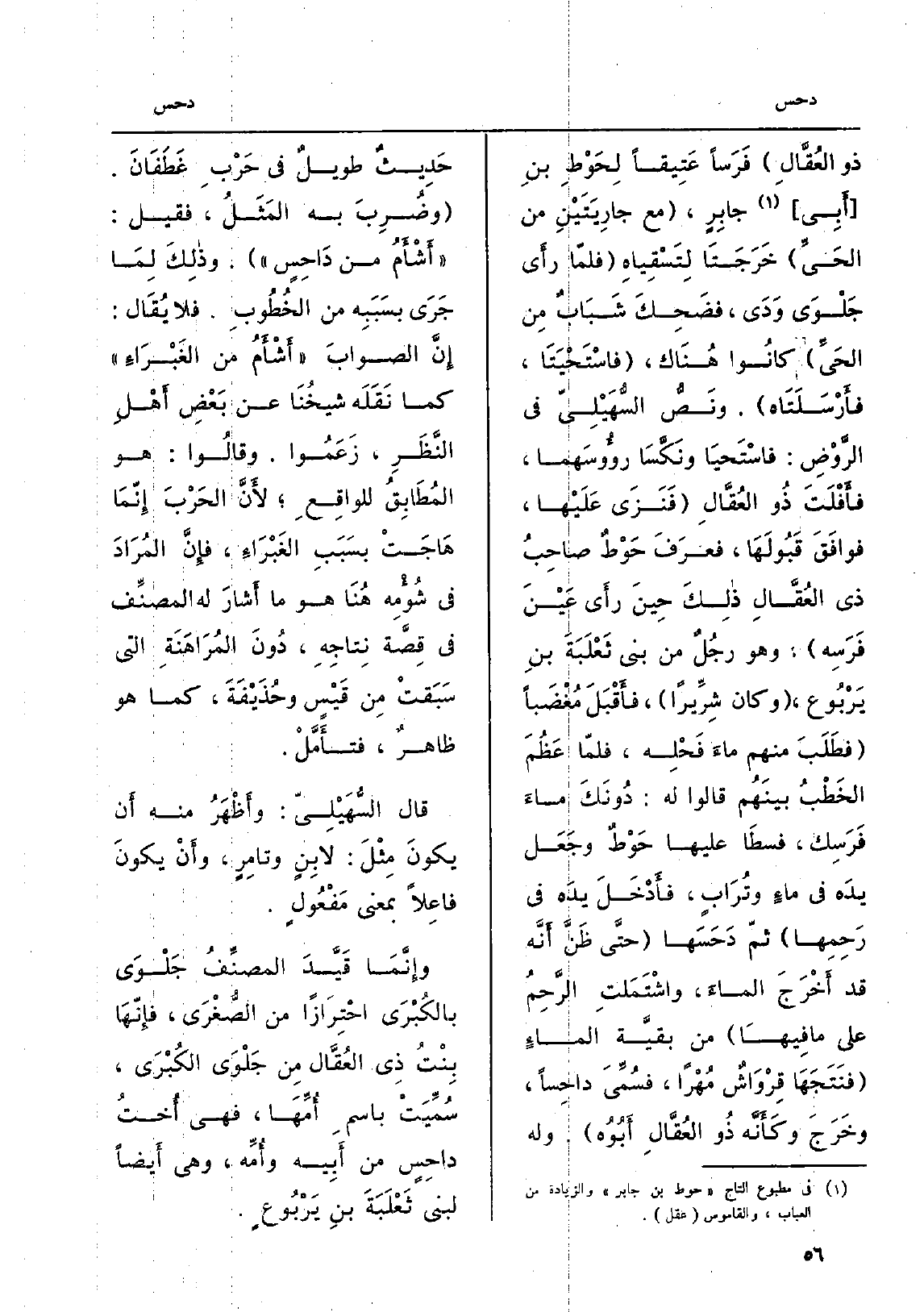 جابِرٍ، مَعَ جارِيَتَيْنِ من الحَيِّ خَرَجَتَا لِتَسْقِياهِ فلّما رأَى جَلْوَى ودَىَ، فضَحِكَ شَبَابٌ مِن الحَيِّ كانُوا هُنَاك، فاسْتَحْيَتَا، فأَرْسَلَتَاه. ونَصُّ السُّهَيْلِيّ فِي الرَّوْضِ: فاسْتَحيَا ونَكِّسَا رؤوُسَهما، فأَفْلَتَ ذُو العقَّالِ فَنَزَى عَلَيْهما، فوافَقَ قَبُولَهَا، فعرَفَ حَوْطٌ صاحِبُ ذِي العُقَّالِ ذلِكَ حِين رأى عين فرسة وَهُوَ رجل من بني ثَعْلَبَةَ بنِ يَرْبُوع، وَكَانَ شِرِّيراً، فأَقْبَلَ مُغْضَباً فطَلَبَ مِنْهُم ماءَ فَحْلِه، فلمّا عَظُمَ الخَطْبُ بينَهُم قَالُوا لَهُ: دُونَكَ ماءَ فَرَسِك، فسَطاَ عَلَيْهَا حَوْطٌ وجَعَلَ يَدَه فِي ماءٍ وتُرَابٍ، فأَدْخَلَ يدَه فِي رَحِمِها ثمَّ دَحَسَها حتَّى ظَنَّ أَنَّه قد أخْرَجَ الماءَ، واشْتَمَلتِ الرَّحِمُ على مَا فِيهَا من بقيَّة الماءِ فنَتَجَها قِرْوَاشٌ مُهْراً، فسُمِّيّ داحِساً، وخَرَجَ وكَأَنَّه ذُو العُقَّالِ أَبُوهُ. وَله حَدِيثٌ طويلٌ فِي حَرْبِ غَطَفَانَ وضُرِبَ بِهِ المَثَلُ فَقيل: أَشْأَمُ من دَاحِسٍ. وذلِكَ لِمَا جَرَى بسَبَبِه من الخُطُوبِ. فَلَا يُقَال: إِنَّ الصوابَ أَشْأَمُ من الغَبْرَاءِ كَمَا نَقَلَه شيخُنَا عَن بَعْضِ أَهْلِ النَّظَرِ، زَعَمُوا. وقالُوا: هُوَ المُطَابِقُ للواقِعِ لأَنَّ الحَرْبَ إِنّمَا هَاجَتْ بسَبَبِ الغَبْرَاءِ، فإِنَّ المُرَادَ فِي شُؤْمِه هُنَا هُوَ مَا أشارَ لَهُ المصنِّف فِي قِصَّة نِتاجِهِ، دُونَ المُرَاهَنَةِ الَّتِي سَبَقتْ مِن قَيْسٍ وحُذَيْفَةَ، كَمَا هُوَ ظاهرٌ، فتأَمَّلْ. قَالَ السُّهَيْلِيّ: وأَظْهَرُ مِنْهُ أَن يكونَ مِثْلَ: لابِنٍ وتامِرٍ، وأَنْ يكونَ فاعِلاً بِمَعْنى مَفْعُولٍ. وإِنَّمَا قَيَّدَ المصنِّفُ جَلْوَى بالكُبْرَى احْتِرَازاً من الصُّغْرَى، فإِنّهَا بِنْتُ ذِي العُقَّال مِن الْكُبْرَى، فإِنَّها سُمِّيتْ باسمِ أُمِّهَا، فَهِيَ أُختُ داحِسٍ من أَبِيه وأُمِّه، وَهِي أَيضاً لبني ثَعْلَبَةَ بنِ يَرْبُوعٍ.