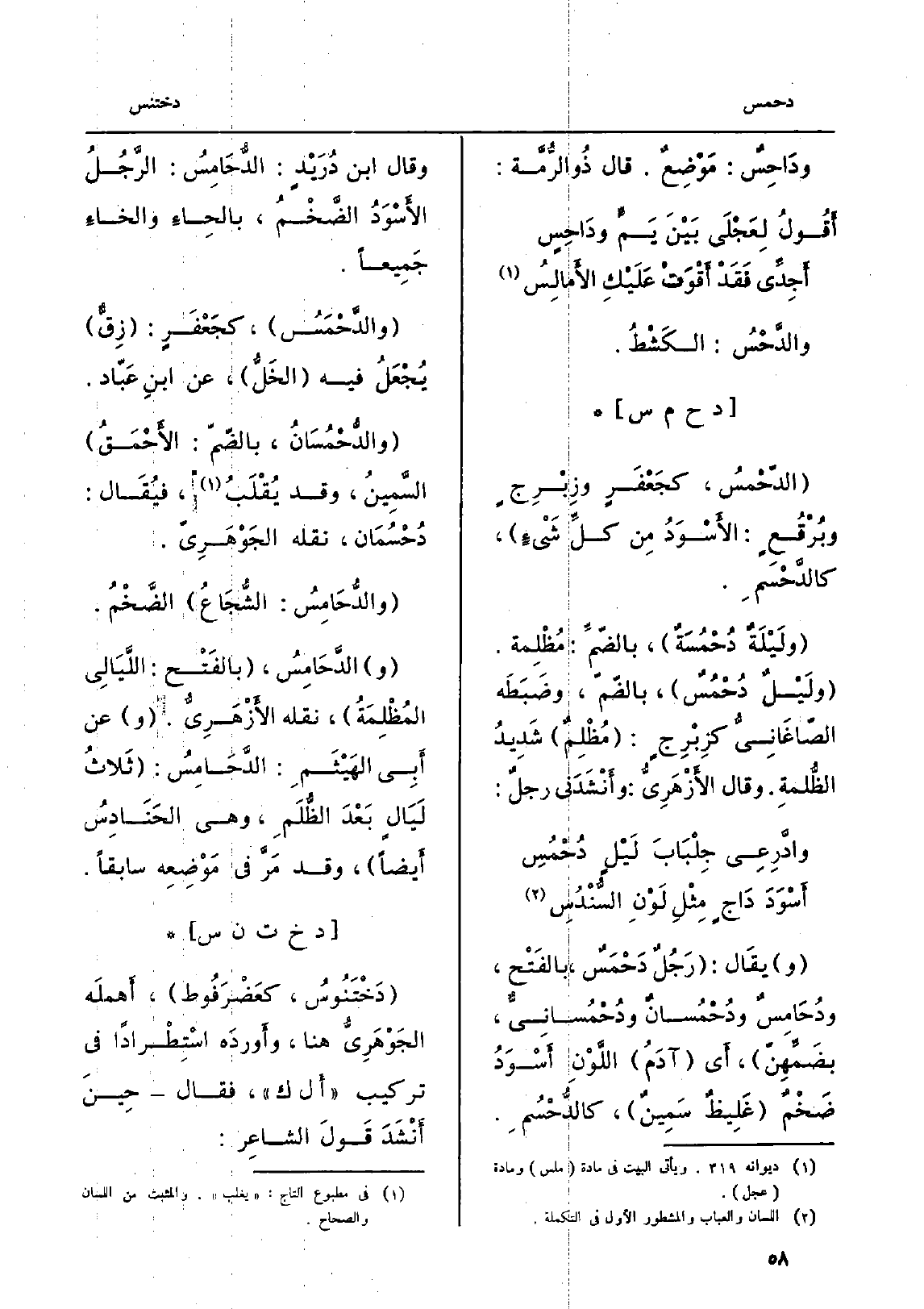 ) الدّحْمسُ، كَجُعْفَرٍ وزِبْرِجٍ وبُرْقُعٍ: الأَسْوَدُ مِن كُلِّ شَيْءٍ، كالدَّحْسَمِ. ولَيْلَةٌ دُحْمُسَةٌ، بالصّمِّ: مُظْلِمة. ولَيْلٌ دُحْمُسٌ، بالضّمّ، وضَبَطَه الصّاغَانِيُّ كزِبْرِجٍ: مُظْلِمٌ شَدِيدُ الظُّلمةِ. وَقَالَ الأَزْهَرِيُّ: وأَنْشَدَنِي رجلٌ:
