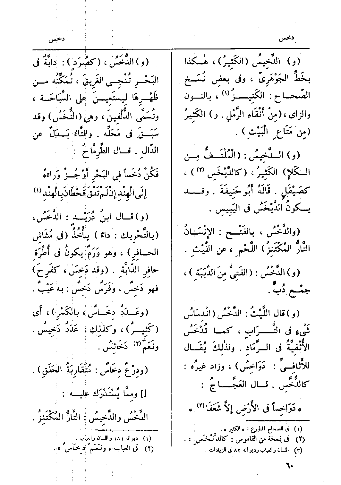 وَقَالَ ابنُ دُرَيْدٍ: الدَّخَسُ، بالتَّحْريك: داءٌ يأْخُذُ فِي مُشَاشِ الحافِرِ، وَهُوَ وَرَمٌ يكونُ فِي أُطْرَةِ حافِرِ الدّابَّةِ. وَقد دَخِسَ، كفَرِحَ فَهُوَ دَخِسٌ، وفَرَسٌ دَخِسٌ: بِهِ عَيْبٌ. وعَدَدٌ دِخَاسٌ، بالكَسْرِ، أَي كَثِيرٌ، وكذلِكَ: عَدَدٌ دَخِيسٌ. ونَعَمٌ دَخَائِسُ. ودِرْعٌ دِخَاسٌ: مُتَقَارِبَةُ الحَلَقِ. ومِمّا يُسْتدْرَكُ عَلَيْهِ: الدَّخْسُ والدَّخِيسُ: التَّارُّ المُكْتَنِزُ.