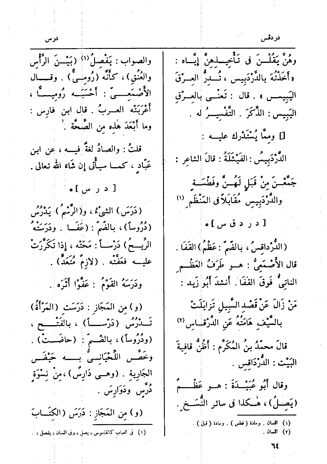 قالَ محمّدُ بنُ المُكَرَّم: أَظُنُّ قافِيةَ البَيْت: الدُّرْدَاقِسِ. وَقَالَ أَبُو عُبَيْدَةَ: هُوَ عَظْمٌ يَصِلُ، هَكَذَا فِي سَائِر النُّسَخِ. وَالصَّوَاب: يَفْصِلُ بَيْنَ الرَّأْسِ والعُنُقِ، كأَنَّه رُومِيٌّ. وَقَالَ الأَصْمَعِيّ: أَحْسَبَه رُومِيّاً، أَعْرَبَتْه العربُ. قَالَ ابْن فارِس: وَمَا أَبْعَدَ هذِهِ مِن الصِّحَّة. قلتُ: والصادُ لغةٌ فِيهِ، عَن ابْن عَبّادٍ، كَمَا سيأْتي إِن شَاءَ الله تَعَالَى.