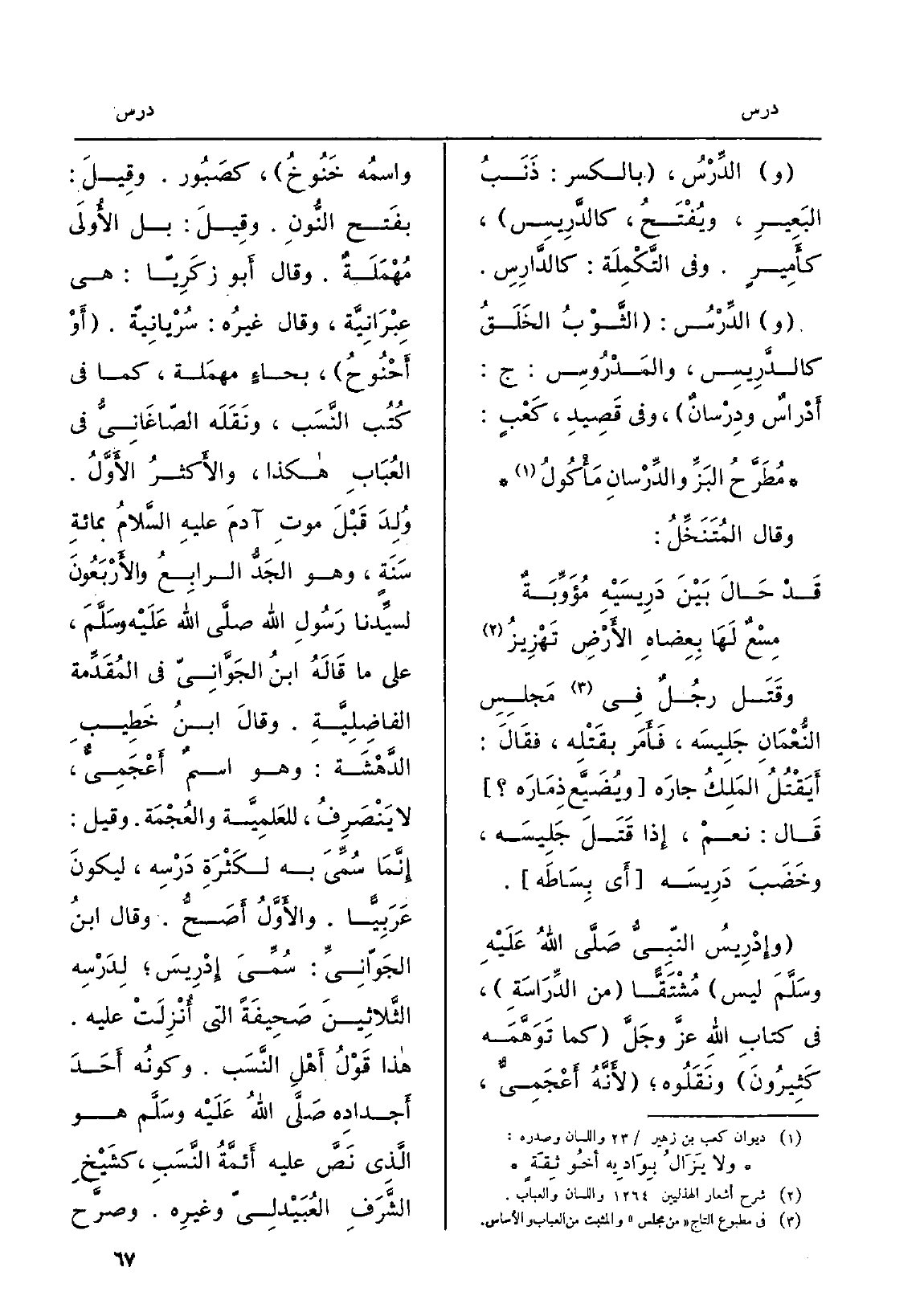 وقَتَل رجُلٌ فِي مَجلِسِ النُّعْمَانِ جَلِيسَه، فأَمَر بقَتْلِه، فقَالَ: أَيَقْتُلُ المَلِكُ جارَه ويُضَيَّعِ ذِمَارَه قَال: نعمْ، إِذا قَتَلَ جَلِيسَه، وخَضَبَ دَرِيسَه أَي بِسَاطَه. وإِدْرِيسُ النّبِيُّ صَلَّى اللهُ عَلَيْهِ وسَلَّمَ لَيْسَ مُشْتَقّاً من الدِّرَاسَةِ، فِي كتابِ اللهِ عزَّ وجَلَّ كَمَا تَوَهَّمْه كَثِيرُونَ ونَقَلُوه لأَنَّهُ أَعْجَمِيٌّ، واسمُه خَنُوخُ، كصَبُور. وقِيلَ: بفَتح النُّونِ. وقِيلَ: بل الأُولَى مُهْمَلَةٌ. وَقَالَ أَبو زكَرِيّا: هِيَ عِبْرَانِيَّة، وَقَالَ غيرُه: سُرْيانِيّة. أَوْ أَخْنُوحُ، بحاءٍ مهمَلة، كَمَا فِي كُتُب النَّسَب، ونَقَلَه الصّاغَانِيُّ فِي العُبَابِ هَكَذَا، والأَكثرُ الأَوَّلُ. وُلِدَ قَبْلَ موتِ آدمَ عليهِ السَّلامُ بمائةِ سَنَةٍ، وَهُوَ الجَدُّ الرابِعُ والأَرْبُعُونَ لسيِّدنا رَسُولِ الله صلَّى الله عَلَيْه وسَلَّمَ، على مَا قَالَهُ ابنُ الجَوَّانِيّ فِي لمُقَدِّمة الفاضِلِيَّةِ. وقالَ ابنُ خَطِيبِ الدَّهْشَة: وَهُوَ اسمٌ أَعْجَمِيٌّ، لَا يَنْصَرِفُ، للعَلمِيَّة والعُجْمَة. وَقيل:) إِنَّمَا سُمِّيّ بِهِ لكَثْرَةِ دَرْسِه، ليكونَ عَرَبِيًّا. والأَوَّلُ أَصَحُّ. وَقَالَ ابنُ الجَوّانِيِّ: سُمِّيَ إِدْرِيسَ لِدَرْسِه الثَّلاثِينَ صَحِيفَةً الَّتِي أُنْزِلَتْ عَلَيْهِ. هَذَا قَوْلُ أَهْلِ النَّسَب. وكونُه أَحَدَ أَجدادِه صلَّى اللهُ عَلَيْه وسَلَّم هُوَ الَّذِي نَصَّ عَلَيْهِ أَئمَّةُ النَّسَبِ، كشَيْخِ الشَّرَفِ العُبَيْدلِيّ وغيرِه. وصرَّح