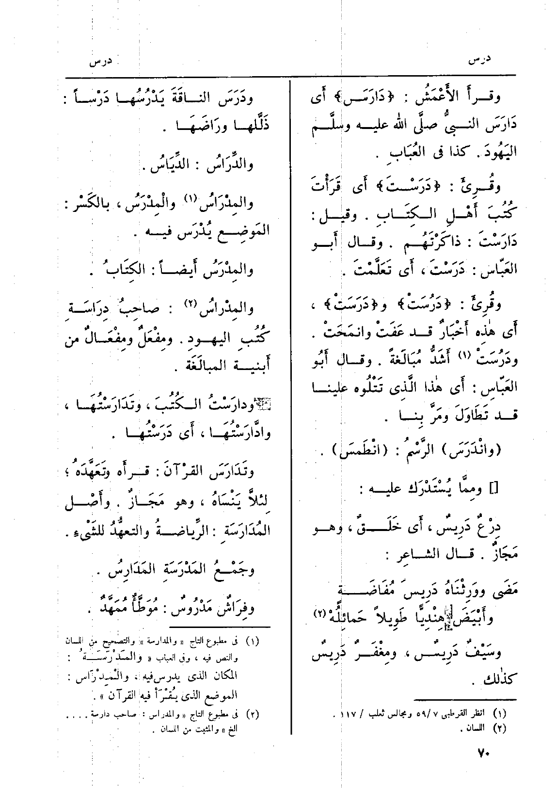 وسَيْفٌ دَرِيسٌ، ومِغْفَرٌ دَرِيسٌ كَذَلِك. ودَرَسَ الناقَةَ يَدْرُسُها دَرْساً: ذَلَّلها ورَاضَهَا. والدِّرَاسُ: الدِّيَاسُ. والمِدْرَاسُ والْمِدْرَسُ، بالكَسْر: المَوضع يُدْرَس فِيهِ. والمِدْرَسُ أَيضاً: الكِتَابُ.