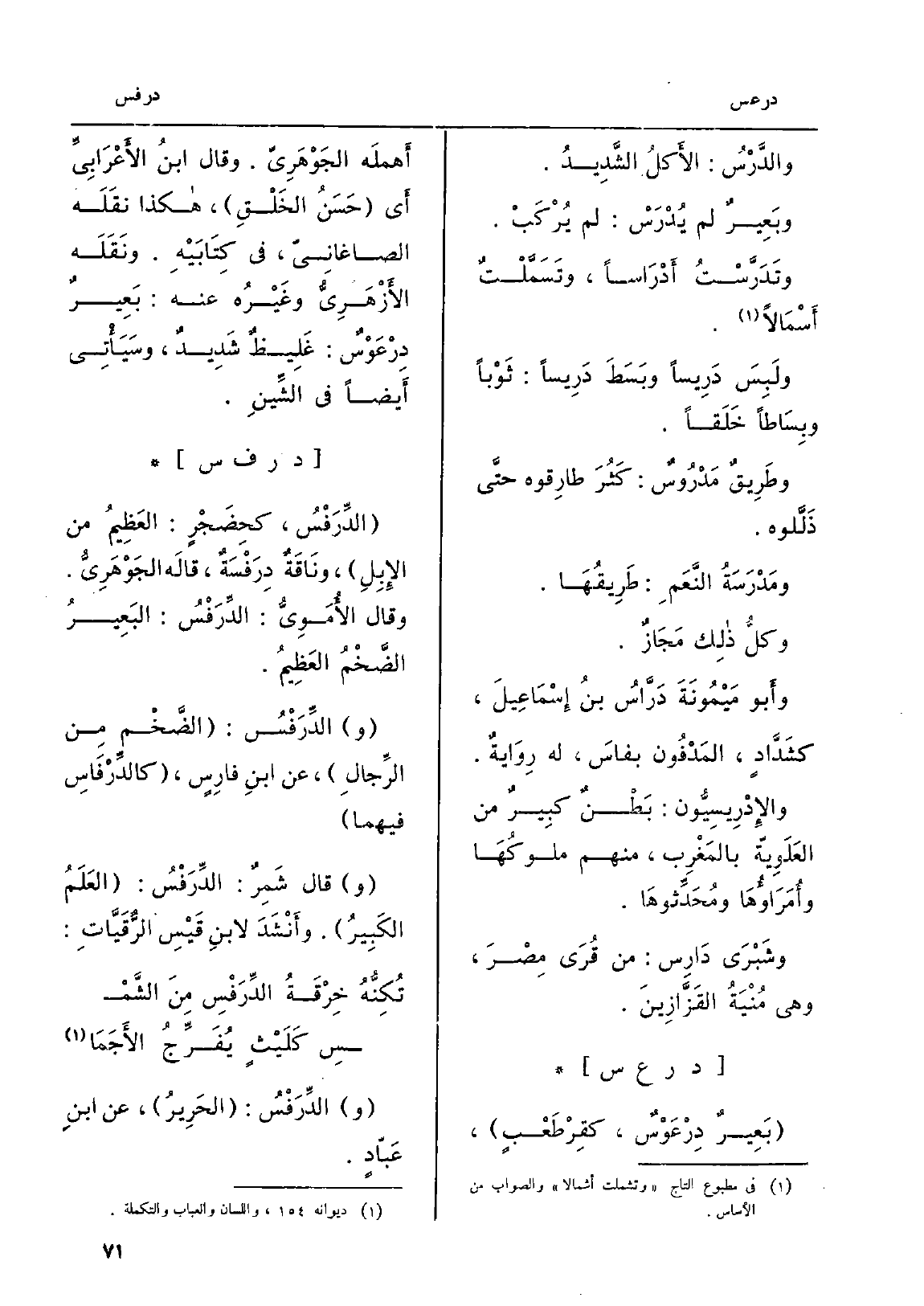 ومَدْرَسَةُ النَّعَمِ: طَرِيقُهَا. وكلُّ ذلِك مَجَازٌ. وأَبو مَيْمُونَةَ دَرَّاسُ بنُ إِسْمَاعِيلَ، كشَدَّادٍ، المَدْفُون بفاسَ، لَهُ رِوَايةٌ. والإِدْرِيسِيُّون: بَطْنٌ كبِيرٌ من العَلَوِيّة بالمَغْرِب، مِنْهُم ملوكُهَا وأُمَرَاؤُهَا ومُحَدِّثوهَا. وشَبْرَى دَارِس: من قُرَى مِصْرَ، وَهِي مَنْيَةُ القَزَّازِينَ.
