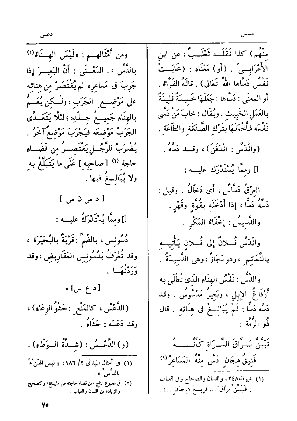 مِنْهُم كَذَا نَقَلَه ثَعْلَبٌ، عَن ابنِ الأَعْرَابِيّ. أَو مَعْنَاه: خَابَتْ نَفْسٌ {دَسَّاها اللهُ تَعَالى. قالَهُ الفَرَّاءُ. أَو المعنَى:) دَسَّاها: جَعَلَها خَسِيسَةً قَلِيلَةً بالعَمَلِ الخَبِيثِ. ويُقَال: خابَ مَنْ دَسَّى نَفْسَه فأَخْمَلَهَا بتَرْكِ الصَّدَقَةِ والطَّاعَةِ.} وانْدَسَّ: انْدَفَنَ، وَقد دَسَّهُ. ومِمَّا يُسْتَدْرَك عَلَيْهِ: العَرْقُ {دَسَّاسٌ، أَي دَخّالُ. وَقيل: دَسَّهُ دَسًّا، إِذا أَدْخَله بقُوَّةٍ وقَهْرٍ.} والدَّسِيسُ: إِخْفَاءُ المَكْرِ. {وانْدَسَّ فُلانٌ إِلى فُلانٍ يَأْتِيهِ بالنَّمَائِمِ، وَهُوَ مَجَازٌ، وَهِي} الدَّسِيسَةُ. {والدَّسُّ: نَفْسُ الهِنَاءِ الّذِي تُطْلَى بِهِ أَرْفَاغُ الإِبِلِ، وبَعِيرٌ} مَدْسُوسٌ. وَقد {دَسَّه} دَسًّا: لَمْ يَبَالغْ فِي هِنَائِه. قَالَ ذُو الرُّمَّة: