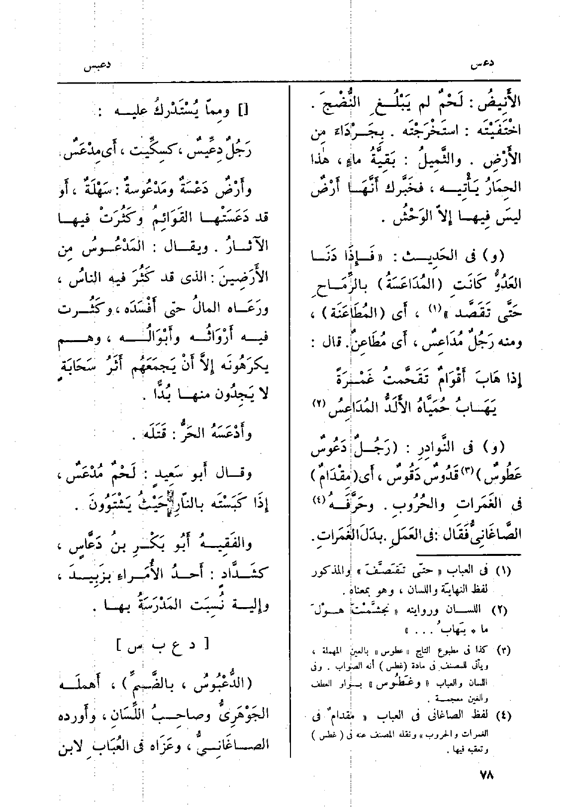 وَفِي النَّوادِرِ: رَجُلٌ دَعُوسٌ عَطُوسٌ قَدُوسٌ دَقُوسٌ، أَي مِقْدَامٌ فِي الغَمَراتِ والحُرُوبِ. وحَرَّفَهُ الصَّاغَانِيُّ فَقَال: فِي العَمَلِ. بدَلَ الغَمَراتِ. ومِمّا يُسْتَدْركُ عَلَيْهِ: رَجُلٌ دِعِّيسٌ، كسِكِّيت، أَي مِدْعَسٌ. وأَرْضٌ دَعْسَةٌ ومَدْعُوسةٌ: سَهْلَةٌ، أَو قد دَعَسَتْها القَوَائِمُ وكَثُرَتْ فِيهَا الآثارُ. وَيُقَال: المَدْعُوسُ مِن الأَرَضِينَ: الَّذِي قد كَثُرَ فِيهِ الناسُ، ورَعَاه المالُ حَتَّى أَفْسَدَه، وكَثُرت فِيهِ أَورْاَثُه)