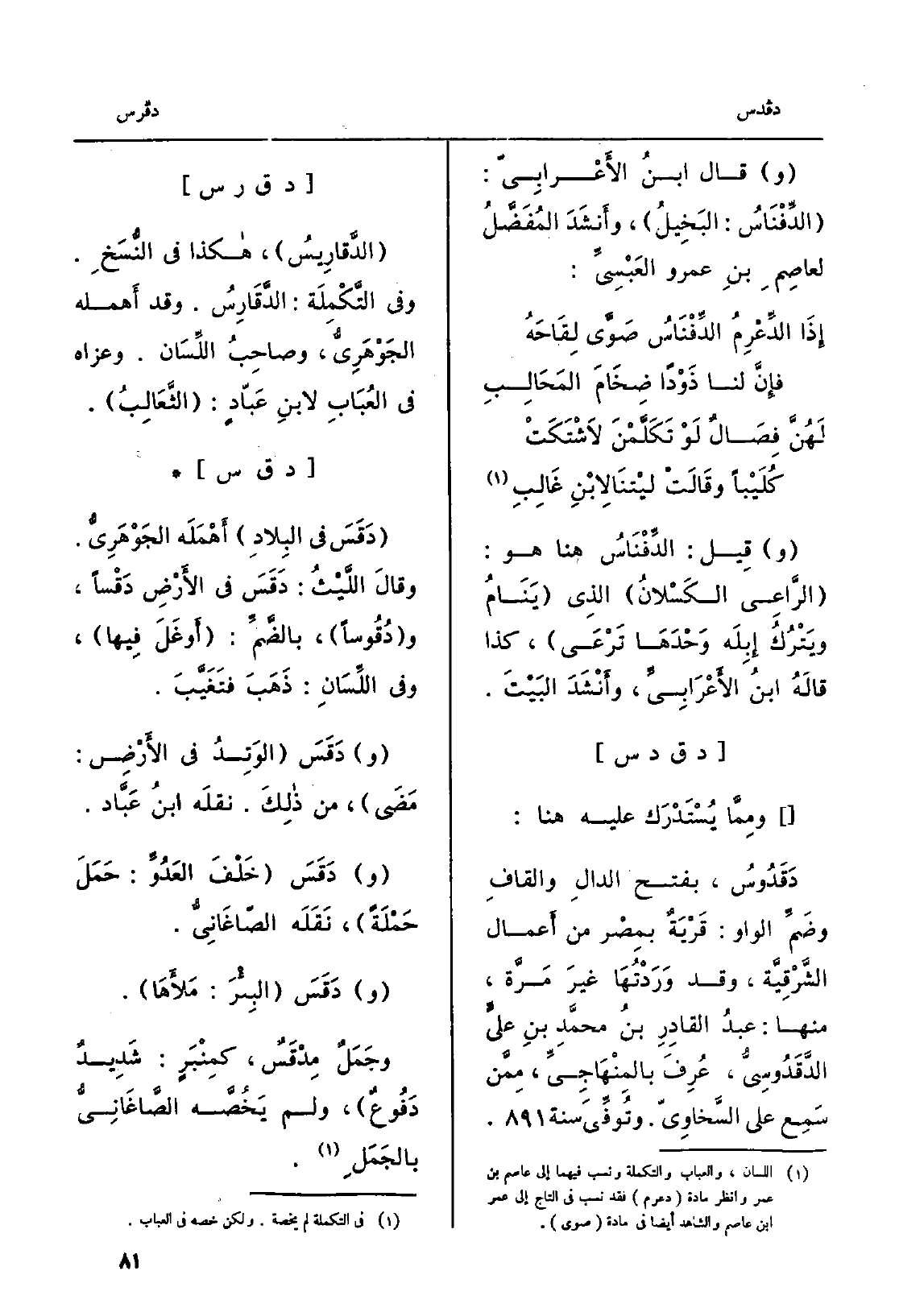 ومِمَّا يُسْتَدْرَك عَلَيْهِ هُنَا: دَقَدُوسُ، بِفَتْح الدالِ والقافِ وضَمِّ الْوَاو: قَرْيَةٌ بمِصْر من أَعمال الشَّرْقِيَّة، وَقد وَرَدْتُهَا غيرَ مَرَّة، مِنْهُ: عبدُ القادِرِ بنُ محمَّدِ بنِ عليٍّ الدَّقَدُوسِيُّ، عُرِفَ بالمِنْهَاجِيِّ، مِمَّن سَمِع على السَّخاوِيّ. وتُوفِّيَ سنة.