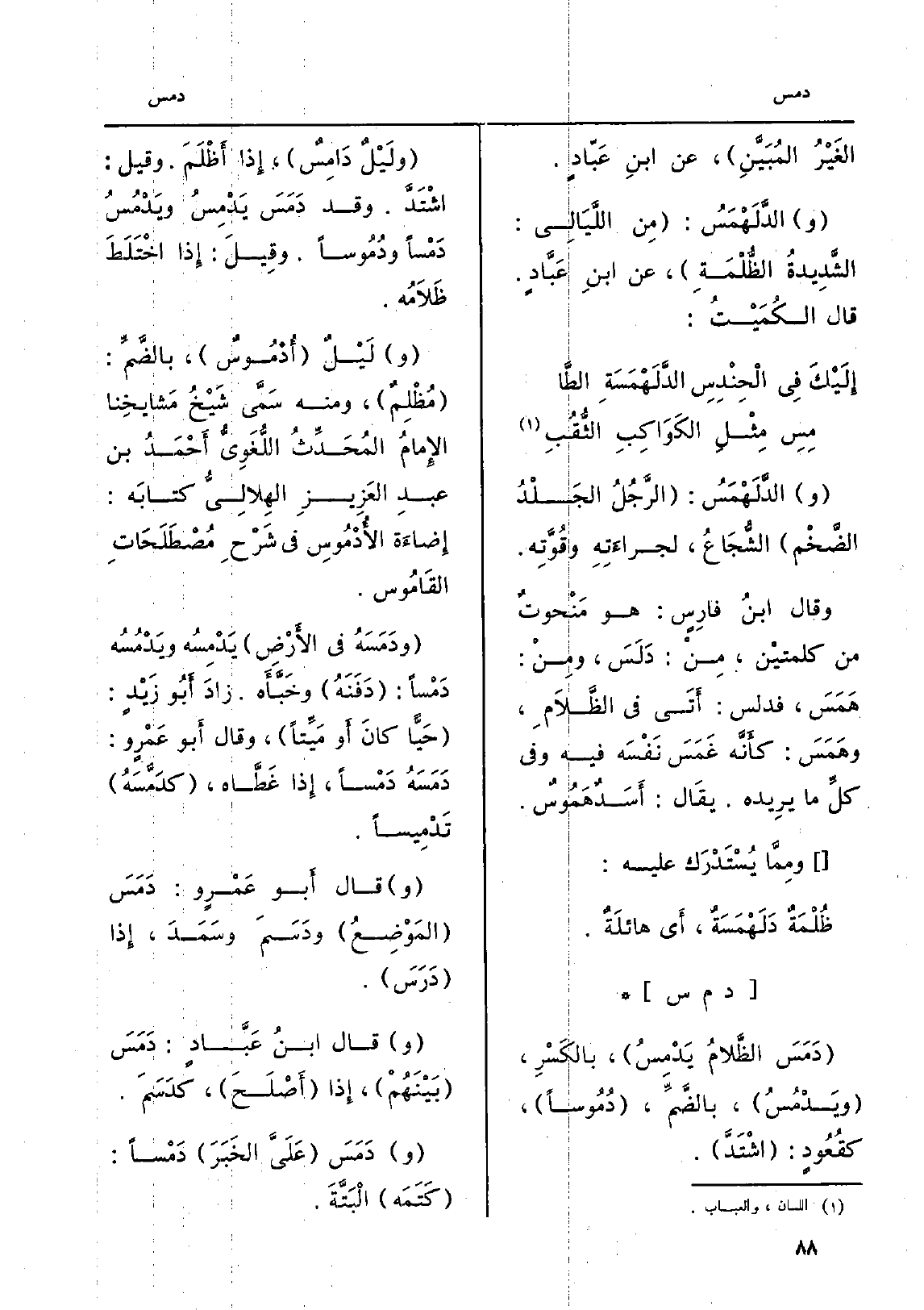 وَقيل: اشْتَدَّ، وَقد دَمَسَ يَدْمِسُ ويَدْمُسُ دَمْساً ودُمُوساً. إِذا اخْتَلَطَ ظَلاَمُه. ولَيْلٌ أُدْمُوسٌ، بالضَّمِّ: مُظْلِمٌ، وَمِنْه سَمَّى شَيْخُ مَشايخِنا الإِمامُ المُحَدِّثُ اللُّغَوِيُّ أَحْمَدُ بن عبدِ العَزِيزِ الهِلالِيُّ كتابَه: إِضاءَة الأُدْمُوسِ فِي شَرْحِ مُصْطَلَحَاتِ القَامُوس. ودَمَسَهُ فِي الأَرْضِ يَدْمِسُه ويَدْمُسُه دَمْساً: دَفَنَهُ وخَبَّأَه. زادَ أَبُو زَيْدٍ: حَيًّا كانَ أَو مَيِّتاً، وَقَالَ أَبو عَمْرٍ و: دَمَسَهُ دَمْساً، إِذا غَطَّاه، كدَمَّسَهُ تَدْمِيساً. وَقَالَ أَبو عَمْرٍ و: دَمَسَ المَوْضِعُ ودَسَمَ وسَمَدَ، إِذا دَرَسَ. وَقَالَ ابنُ عَبَّادٍ: دَمَسَ بَيْنَهُمْ، إِذا أَصْلَحَ، كدَسَمَ. ودَمَسَ عَلَيَّ الخَبَرَ دَمْساً: كَتَمَه الْبَتَّةَ.