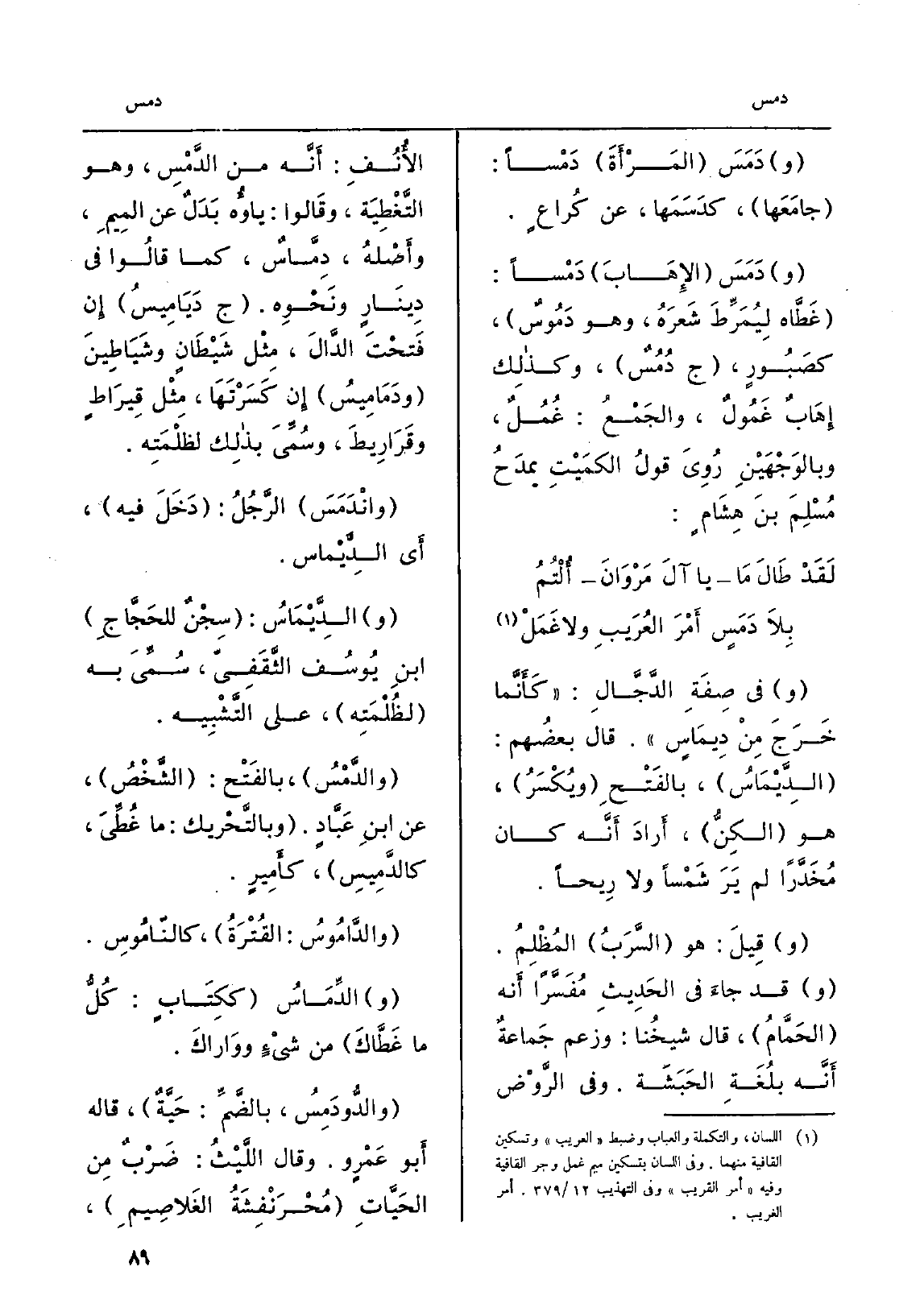 ودَمَسَ المَرْأَةَ دَمْساً: جامَعَها، كدَسَمَها، عَن كُراعٍ. ودَمَسَ الإِهَابَ دَمْساً: غَطَّاه لِيُمَرِّطَ شَعَرهُ، وَهُوَ دَمُوسٌ، كصَبُورٍ، ج دُمُسٌ، وكذلِك إِهَابٌ غَمُولٌ، والجَمْعُ: غُمُلٌ، والوَجْهَيْنِ رُوِيَ قولُ الكمَيْتِ يمدَحُ مُسْلِمَ بن هِشَامٍ: لَقَدْ طَالَ مَايا آلَ مَرْوَانَأُلْتُمُبِلاَ دَمَسٍ أَمْرَ العُرَيبِ وَلَا غَمَلْ وَفِي صِفَةِ الدَّجَّالِ: كأَنَّما خَرَجَ مِنْ دِيمَاسٍ. قَالَ بعضُهم: الدِّيْمَاسُ، بالفَتْحِ ويُكْسَرُ، هُوَ الكِنُّ، أَرادَ أَنَّه كَانَ مُخَدَّراً لم يَرَ شَمْساً وَلَا رِيحاً. وقِيلَ: هُوَ السَّرَبُ المُظْلِمُ. وَقد جاءَ فِي الحَدِيثِ مُفَسَّراً أَنه الحَمَّامُ، قَالَ شيخُنا: وَزعم جَماعةٌ أَنَّه بلُغَةِ الحَبَشَة. وَفِي الرَّوْض الأُنُفِ: أَنَّه من الدَّمْسِ، وَهُوَ التَّغْطِيَة، وقَالوا: ياؤُه بَدَلٌ عَن المِيمِ، وأَصْلهُ، دِمَّاسٌ، كَمَا قالُوا فِي دِينَارٍ ونَحْوِه.) ج دَيَامِيسُ إِن فَتحْتَ الدَّالَ، مِثْل شَيْطَانٍ وشَيَاطِينَ ودَمَامِيسُ إِن كَسَرْتَهَا، مِثْل قِيرَاطٍ وقَرَارِيطَ، وسُمِّيَ بذلِك لظلْمَتِه. وانْدَمَسَ الرَّجُلُ: دَخَلَ فِيهِ، أَي الدَّيْماس. والدَّيْماس: سِجْنٌ للحَجَّاجِ ابنِ يُوسُف الثَّقَفِيّ، سُمِّيَ بِهِ لظُلْمَتِه، على التَّشْبِيه. والدَّمْسُ، بالفَتح: الشَّخْصُ، عَن ابنِ عَبَّادٍ.