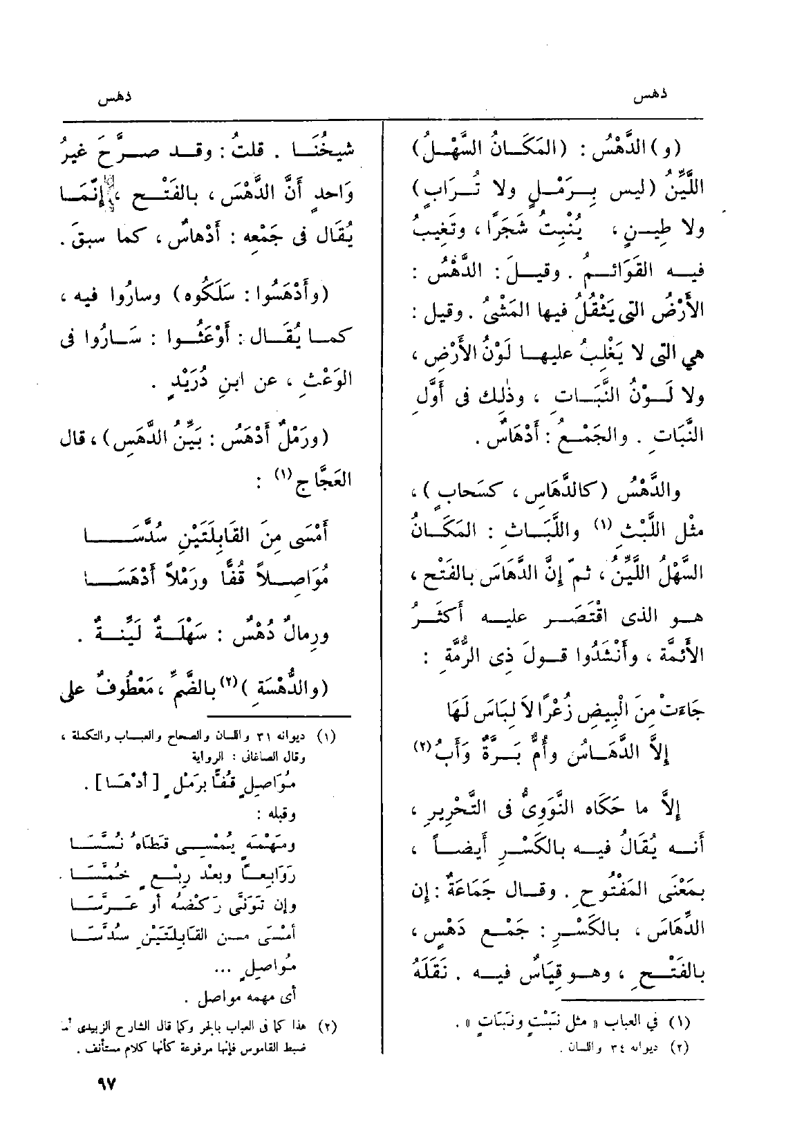 والدَّهْسُ: المَكَانُ السَّهْلُ اللَّيِّنُ لَيْسَ بِرَمْلٍ وَلَا تُرَابٍ وَلَا طِينٍ، يُنْبِتُ شَجَراً، وتَغِيبُ فِيهِ القَوَائمُ. وقيلَ: الدَّهْسُ: الأَرْضُ الَّتِي يَثْقُلُ فِيهَا المَشْيُ، وَقيل: هِيَ الَّتِي لَا يَغْلِبُ عَلَيْهَا لَوْنُ الأَرْضِ، وَلَا لَوْنُ النَّبَاتِ، وذلِك فِي أَوَّلِ النَّبَاتِ. والجَمْعُ: أَدْهَاسٌ. والدَّهْسُ كالدَّهَاسٍ، كسَحابٍ، مثْل اللَّبْثِ واللَّبَاثِ: المَكَانُ السَّهْلُ الَّليِّنُ، ثمّ إِنَّ الدَّهَاسَ بالفَتْح، هُوَ الَّذِي اقْتَصَر عَلَيْهِ أَكثَرُ الأَئمَّة، وأَنْشَدُوا قولَ ذِي الرُّمَّةِ: