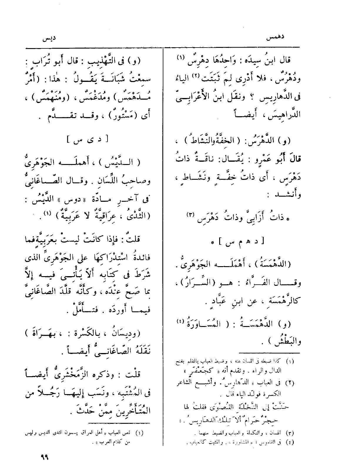 {الدَّيْسُ، أَهملَه الجَوْهَرِيُّ وصاحِبُ اللِّسَانِ، وَقَالَ الصّاغَانِيُّ فِي آخرِ مادّة دوس الدَّيْسُ: الثَّدْيُ، عِرَاقِيَّةٌ لَا عَرَبِيَّةٌ. قلتُ: فإِذا كانَتْ ليستْ بعَرَبِيَّةٍ فَمَا فائدةُ اسْتِدْرَاكِهَا على الجَوْهَرِيِّ الَّذِي شَرَطَ فِي كِتَابِه أَلاّ يَأْتِيَ فِيهِ إِلاَّ بِمَا صَحَّ عِنْدَه، وكأَنَّه قلَّدَ الصَّاغَانِيَّ فِيمَا أَوردَه. فتأَمَّلْ.} ودِيسَانُ، بالكَسْرة: بهَرَاةَ نَقَلَهُ الصّاغَانِيُّ أَيضاً. قلْت: وَذكره الزَّمَخْشَرِيُّ أَيضاً فِي المُشْتَبِه، ونَسَب إِليهَا رَجُلاً من المُتَأَخِّرِينَ مِمَّنْ حَدَّثَ.