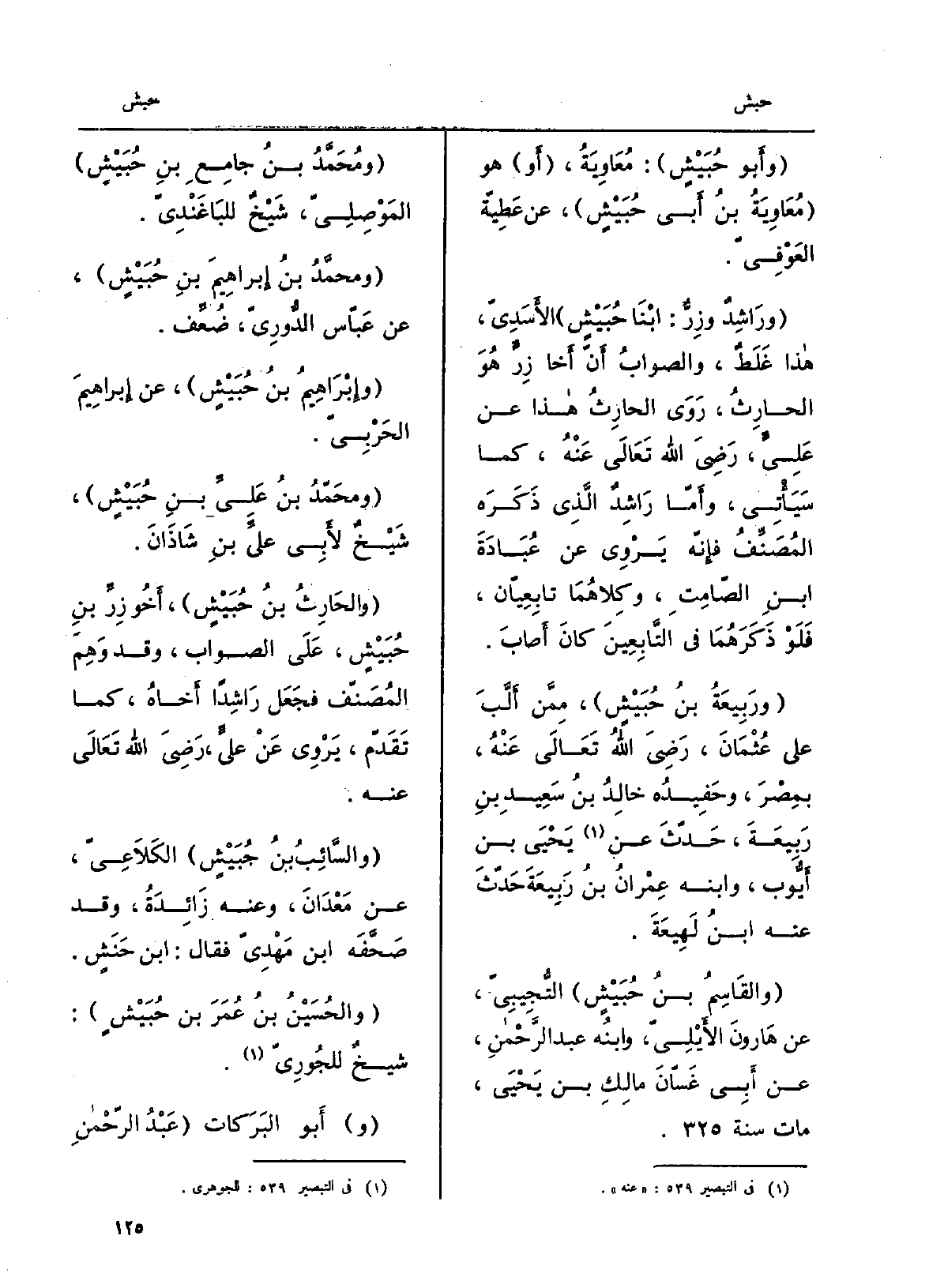 وأَبو حُبَيْشٍ: مُعَاوِيَةُ، أَو هُوَ مُعَاوِيَةُ بنُ أَبي حُبَيْشٍ، عَن عَطِيّة العَوْفِيّ. ورَاشِدٌ وزِرٌّ: ابْنَا حُبَيْش الأَسَدِيّ، هَذَا غَلَطٌ، والصوابُ أَنّ أَخا زِرٍّ هُوَ الحارِثُ، رَوَى الحارِثُ هَذَا عَن عَلِيٍّ، رَضِيَ الله تَعَالَى عَنْهُ، كَمَا سَيَأْتِي، وأَمّا رَاشِدٌ الَّذِي ذَكَرَه المُصَنِّفُ فإنّه يَرْوِي عَن عُبَادَةَ ابنِ الصّامِتِ، وكِلاهُمَا تابِعِيّان، فَلَوْ ذَكَرَهُمَا فِي التَّابِعِينَ كانَ أَصابَ. ورَبِيعَةُ بنُ حُبَيْشٍ، مِمَّن أَلَّبَ على عُثْمَانَ، رَضِيَ اللهُ تَعَالَى عَنْهُ، بمِصْرَ، وحَفِيدُه)