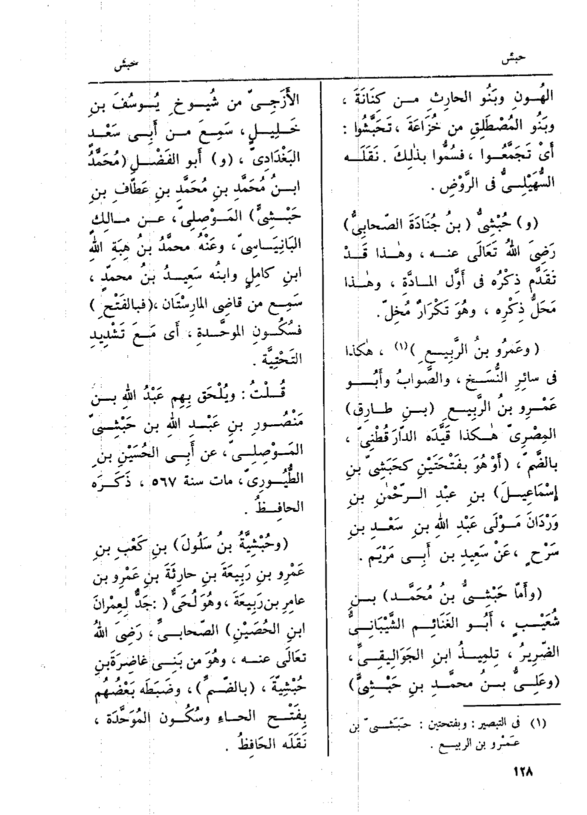 وعَمروُ بنُ الرَّبِيعِ، هَكَذَا فِي سائِرِ النُّسَخ، والصَّوابُ وأَبُو عَمْروِ بنُ الرَّبِيعِ بنِ طَارق المِصْريّ هَكَذَا قَيَّدَه الدّارَ قُطْنِيّ، بالضَّمّ، أَوْ هُوَ بفَتْحَتَيْنِ كحَبَشِيّ بنِ إِسْماعِيلَ بنِ عَبْدِ الرّحْمنِ بنِ وَرْدَانَ مَوْلَى عَبْدِ اللهِ بنِ سَعْدِ بنِ سَرْحٍ، عَنْ سَعِيدِ بن أَبِي مَرْيَم. وأَمّا حَبْشِيُّ بنُ مُحَمَّد بنِ شُعَيْبٍ، أَبُو الغَنَائِم الشَّيْبَانِيُّ الضّرِيرُ، تِلميذُ ابنِ الجَوَالِيقيِّ، وعَليُّ بنُ محمَّدِ بنِ حَبْشِيٍّ الأَزَجِيّ من شُيوخِ يُوسُفَ بنِ خَلِيلٍ، سَمِعَ من أَبِي سَعْد البَغْدَاديّ، وأَبو الفَضْلِ مُحَمَّدُ ابنُ مُحَمَّدِ بنِ مُحَمَّدِ بنِ عَطّافِ بنِ حَبْشِيٍّ المَوْصِليّ، عَن مالِكٍ البَانِيَاسِيّ، وعَنْهُ محمَّدُ بنُ هِبَةِ اللهِ ابنِ كامِلٍ وابنُه سَعِيدُ بنُ محمّدٍ، سَمِع من قَاضِي المارِسْتَان، فبالفَتْحِ فسُكُونِ الموحَّدةِ، أَي مَعَ تَشْدِيدِ التَحْتِيَّة. قُلْتُ: ويُلْحَق بِهِم عَبْدُ اللهِ بن مَنْصُورِ بنِ عَبْدِ اللهِ بن حَبْشِيّ المَوْصِلِيّ، عَن أَبِي الحُسَيْنِ بنِ الطُّيُورِيّ، مَاتَ سنة، ذَكَرَه الحافِظُ. وحُبْشيَّةُ بنُ سَلُولَ بنِ كَعْبِ بنِ عَمْرِو بنِ رَبْيعَةَ بنِ حارِثَةَ بنِ عَمْرِو بن عامِرِ بن رَبِيعَةَ، وهُوَ لُحَىٌّ: جَدٌّ لِعِمْرانَ ابنِ الحُصَيْنِ الصّحابيِّ، رَضِيَ اللهُ تَعَالَى عَنهُ، وهُوَ من بَنِي غَاضِرَةَ بنِ حُبْشِيّةَ، بالضّمِّ، وضَبَطَه بَعْضُهُم بِفَتْح الحاءِ وسُكُون المُوَحَّدَة، نَقَلَه الحَافِظُ.