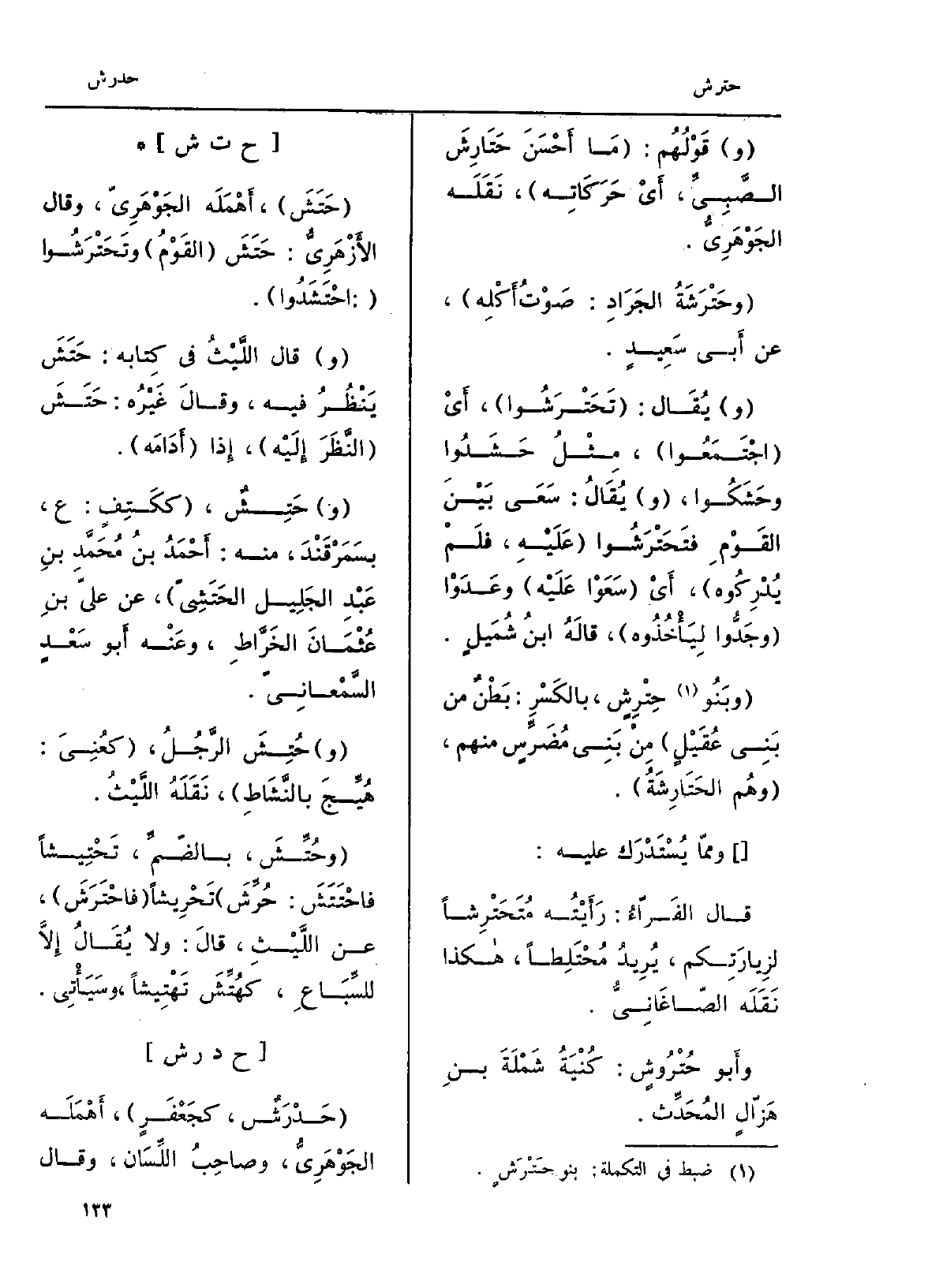 . حَتَشَ، أَهْمَلَه الجَوْهَرِيّ، وَقَالَ الأَزْهَرِيُّ: حَتَشَ القَوْمُ وتَحَتْرَشُوا: احْتَشَدُوا. وَقَالَ اللَّيْثُ فِي كِتابه: حَتَشَ يَنْظُرُ فِيهِ، وقالَ غَيْرُه: حَتَشَ النَّظَرَ إلَيْه، إِذا أَدَامَه. وحَتِشٌ، ككَتِفٍ: ع، بسَمَرْقَنْدَ، مِنْهُ: أَحْمَدُ بنُ مُحَمَّدِ بنِ عَبْدِ الجَلِيل الحَتَشِيّ، عَن عليّ بنِ عُثْمَانَ الخَرَّاطِ، وعَنْه أَبو سَعْدٍ السَّمْعانِيّ. وحُتِشَ الرَّجُلُ، كعُنِىَ: هُيِّجَ بالنَّشَاطِ، نَقَلَهُ اللَّيْثُ. وحُتِّشَ، بالضّمِّ، تَحْتِيشاً فاحْتَتَشَ: حُرِّشَ تَحْرِيشاً فاحْتَرَشَ، عَن اللِّيْثِ، قالَ: وَلَا يُقَالُ إلاَّ للسِّبَاعِ، كهُتِّشَ تَهْتِيشاً، وسَيَأْتِي.