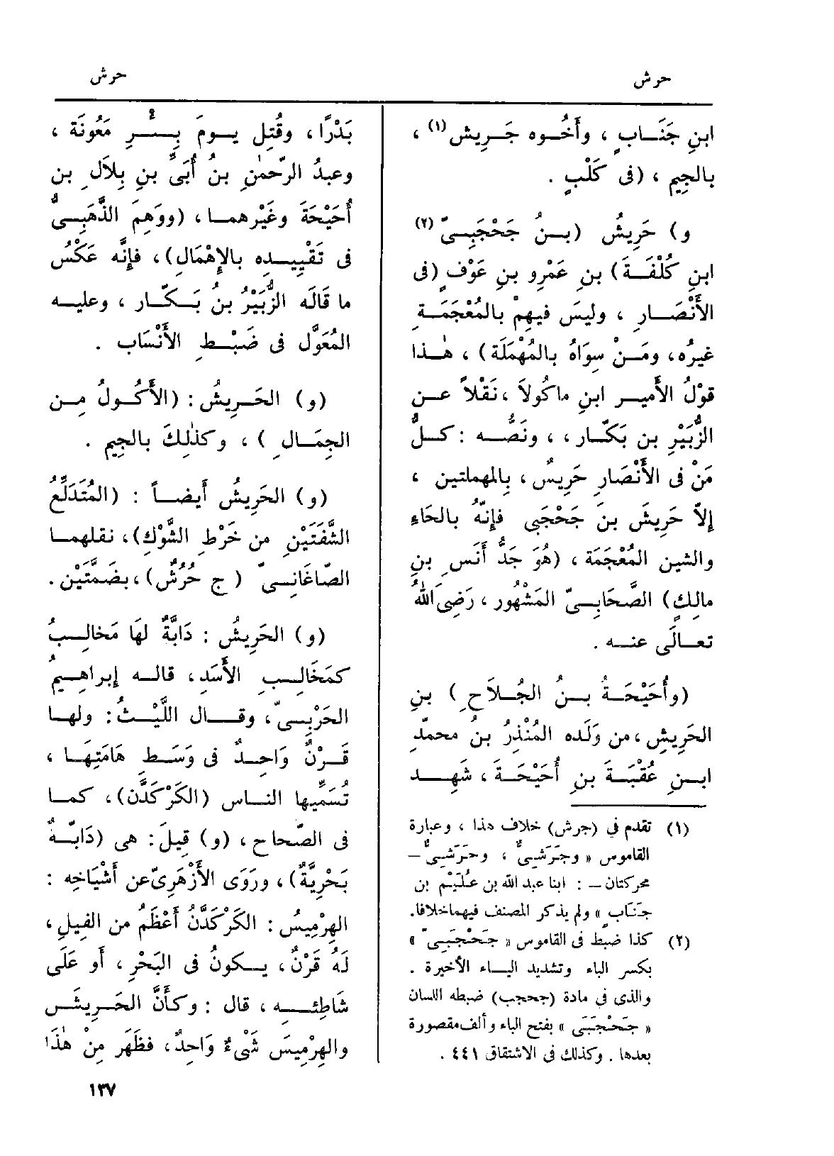 ابنِ جَنَابٍ، وأَخُوه جَرِيش، بالجِيم، فِي كَلْبٍ. وحَرِيشُ بنُ جَحْجَبِيّ ابنِ كُلْفَةَ بنِ عَمْروِ بنِ عَوْفٍ فِي الأَنْصَارِ، وليسَ فيهِمْ بالمُعَجَمَةِ غيرُه، ومَنْ سِوَاهُ بالمُهْمَلَة، هَذَا قَوْلُ الأَمير ابنِ ماكُولاَ، نَقْلاً عَن الزُّبَيْرِ بن بَكّار، ونَصُّه: كلُّ مَنْ فِي الأَنْصَارِ حَرِيسٌ، بِالمهملتين، إلاّ حَرِيشَ بن جَحْجَبي فإنّهُ بالحَاءِ والشين المُعْجَمَة، هُوَ جَدُّ أَنَسِ بنِ مالِكٍ الصَّحَابِيّ المَشْهُور، رَضِيَ اللهُ تعالَى عَنهُ. وأُحَيْحَةُ بنُ الجُلاَحِ بنِ الحَرِيشِ، من وَلَده المُنْذِرُ بنُ محمّدِ ابنِ عُقْبَةَ بنِ أُحَيْحَةَ، شَهِد بَدْراً، وقُتِل يومَ بِئْرِ مَعُونَة، وعبدُ الرّحمنِ بنُ أُبَيِّ بنِ بِلالِ بن أُحَيْحَةَ وَغَيْرهما، ووَهِمَ الذَّهَبِيُّ فِي تَقْيِيدِه بالإهْمَالِ، فإنَّه عَكْسُ مَا قَالَه الزُّبَيْرُ بنُ بَكّار، وَعَلِيهِ المُعَوَّل فِي ضَبْطِ الأَنْسَاب. والحَرِيشُ: الأَكُولُ من الجِمَالِ، وكذلِكَ بالجِيم. والحَرِيشُ أَيضاً: المُتَدَلِّعُ الشَّفَتَيْنِ من خَرْطِ الشَّوْكِ، نقلهما الصّاغَانِيّ ج حُرُشٌ، بضَمَّتَيْن. والحَرِيشُ: دَابَّةٌ لَها مَخالِبُ كمَخَالِبِ الأَسَدِ، قَالَه إِبراهِيمُ الحَرْبِيّ، وقالَ اللَّيْثُ: وَلها قَرْنٌ وَاحِدٌ فِي وَسَطِ هَامَتِها، تُسَمِّيها النَاس الكَرْكَدَّن، كَمَا فِي الصّحاح، وقِيلَ: هِيَ دَابّةٌ بَحْرِيَةٌ، ورَوَى الأَزْهَرِيّ عَن أَشْيَاخِهِ: الهِرْمِيسُ: الكَرْكَدَّنُ أَعْظَمُ من الفِيْلِ، لَهُ قَرْنٌ، يكونُ فِي البَحْرِ، أَو عَلَى شَاطِئِهِ، قَالَ: وكأَنَّ الحَرِيشَ والهِرْمِيسَ شَئٌ وَاحِدٌ، فظَهَر مِنْ هذَا