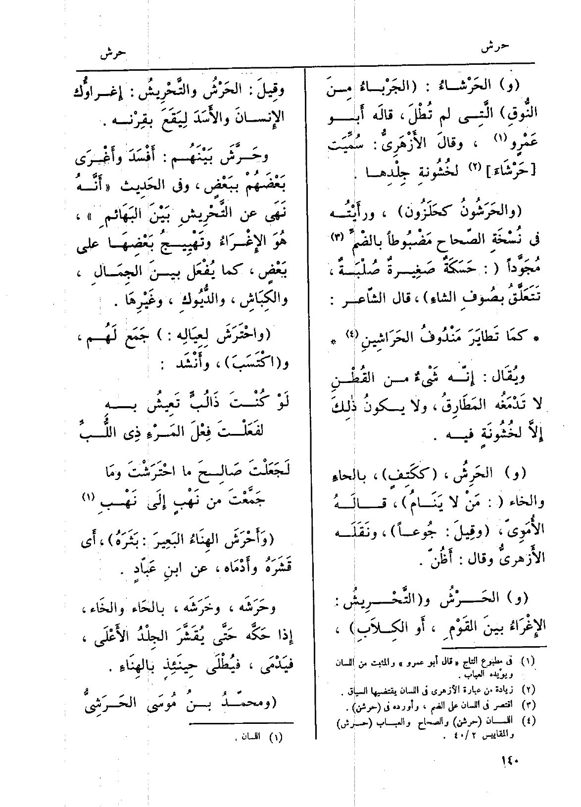 والحَرْشَاءُ الجَرْبَاءُ مِنَ النُّوقِ الَّتِي لم تُطْلَ، قالَه أَبو عَمْروٍ، وقالَ الأَزْهَرِيُّ: سُمِّيَت حَرْشَاءَ لخُشُونةِ جِلْدِها. والحَرَشُونُ كحَلَزُون، ورأَيْتُه فِي نُسْخَةِ الصّحاح مَضْبُوطاً بالضْمِّ مُجَوَّداً: حَسَكَةٌ صَغِيرةٌ صُلْبَةٌ، تَتَعَلَّقُ بصُوفِ الشاءِ، قَالَ الشّاعر: كمَا تَطايَرَ مَنْدُوفُ الحَرَاشِينِ. ويُقَال: إنّه شَئٌ من القُطْنِ لَا تَدْمَغُه المَطَارِقُ، وَلَا يكونُ ذلِكَ إلاَّ لخُشُونَةٍ فِيهِ. والحَرِشُ، كَكَتِفٍ، بالحاءِ وَالْخَاء: مَنْ لَا يَنَامُ، قالَهُ الأُمَوِيّ، وقِيلَ: جُوعاً، ونَقَلَه الأَزْهريُّ وَقَالَ: أَظُنّ. والحَرْشُ والتّحْرِيشُ: الإِغْرَاءُ بينَ القَوْمِ، أَو الكِلاَبِ، وقِيلَ: الحَرْشُ والتَّحْريشُ: إغراؤُك الإنسانَ والأَسَدَ) لِيَقَعَ بِقرْنه. وحَرَشَ بَيْنَهُم: أَفْسَدَ وأَغْرَى بَعْضَهُمُ ببعَض، وَفِي الحَدِيث أَنَّهُ نَهَى عَن التَّحْرِيشِ بَيْنَ البَهَائمِ، هُوَ الإِغْرَاءُ وتَهْيِيجُ بَعْضِهَا على بَعْضٍ، كَمَا يُفْعَل بينَ الجِمَالِ، والكِبَاش، والدُّيُوكِ، وغَيْرِهَا. واحْتَرَشَ لِعِيَالِه: جَمَع لَهُم، واكْتَسَبَ، وأنَشْدَ: