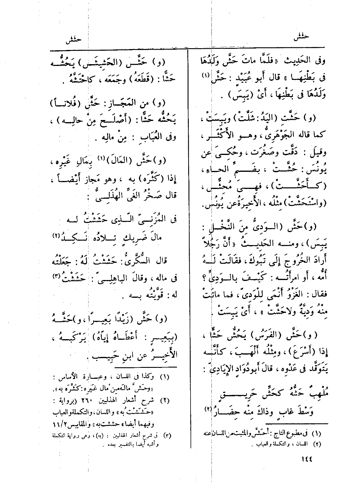 وَفِي الحَدِيث فلَمَّا ماتَ {حَشَّ وَلَدُهَا فِي بَطْنِهَا قَالَ أَبو عُبَيْدٍ: حَشَّ وَلَدُهَا فِي بَطْنِهَا، أَيْ يَبِسَ. و} حَشَّتِ اليَدُ: شَلَّتْ ويَبِسَتْ، كَمَا قَالَه الجَوْهَرِيُّ، وَهُوَ الأَكْثَر، وقيلَ: دَقَّت وصَغُرَت، وحُكِىَ عَن يُونُسَ: {حُشَّتْ، بضَمِّ الحاءِ،} كأَحَشَّتْ، فهِيَ {مُحِشٌّ،} واسْتَحَشَّتْ مِثْلُه، الأَخِيرَةُ عَن يُونُس. وحَشَّ الوَدِيُّ مِنَ النَّخْلِ: يَبِسَ، وَمِنْه الحَدِيثُ أَنَّ رَجُلاً أَرادَ الخُرُوجَ إلَى تَبُوكَ، فقَالَتْ لَهُ أُمُّه، أَو امرأَتُه: كَيْفَ بالوَدِيِّ فَقَالَ: الغَزْوُ أَنْمَى لِلْوَدِيّ، فَمَا ماتَتْ مِنْهُ وَدِيّةٌ وَلَا {حَشَّتْ، أَيْ يَبِسَتْ. وحَشَّ الفَرَسُ} يَحُشُّ {حَشّاً، إِذا أَسْرَعَ، ومِثْلُه أَلْهَبَ، كأَنَّه يَتَوَقَّد فِي عَدْوِه، قالَ أَبو دُوَادٍ الإِيَادِيّ: