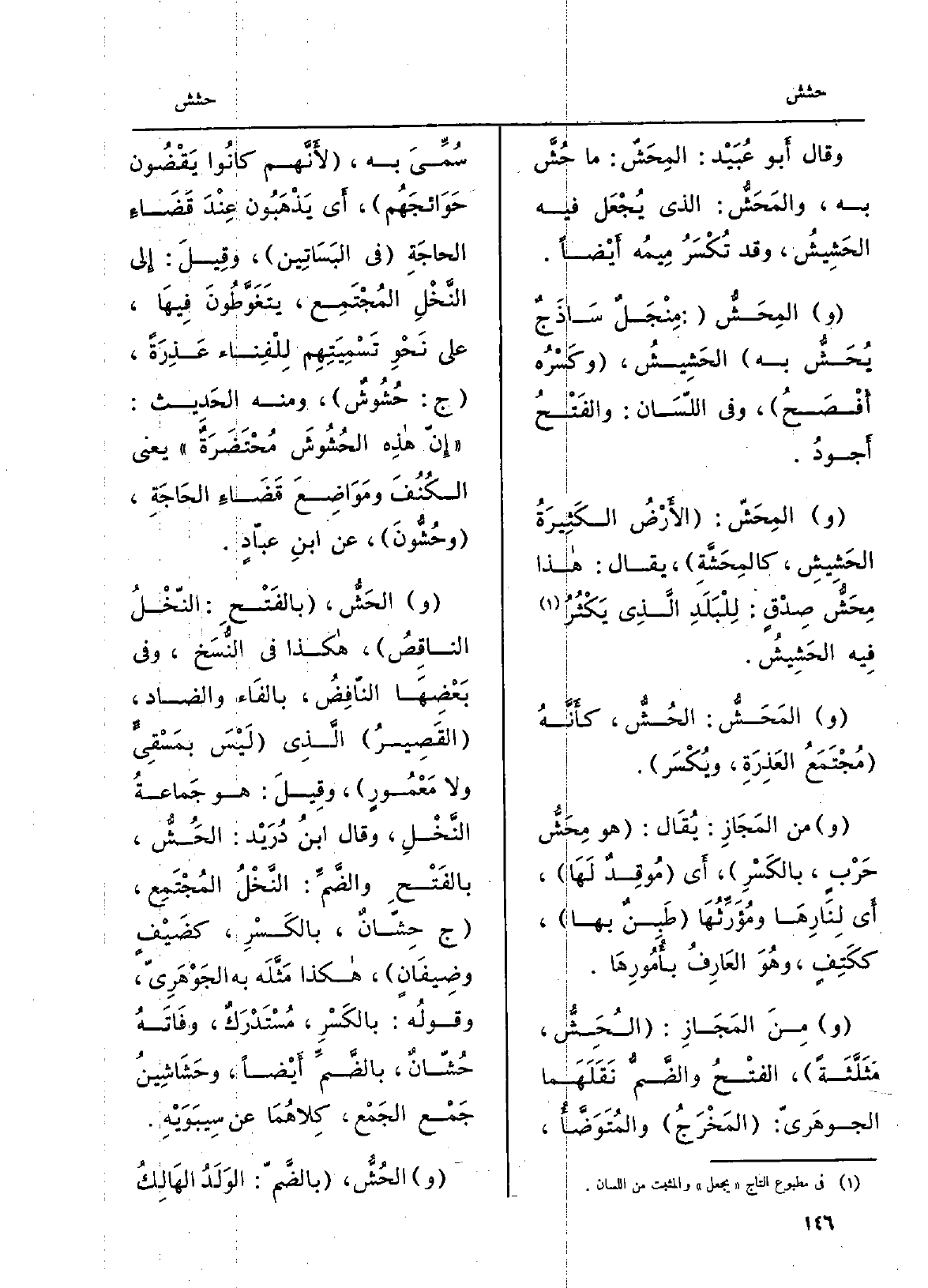 وَقَالَ أَبو عُبَيْد: {المِحَشّ: مَا} حُشَّ بِهِ، {والمَحَشُّ: الَّذِي يُجْعَل فِيهِ} الحَشِيشُ، وَقد تُكْسَرُ مِيمهُ أَيْضاً. والمِحَشُّ: مِنْجَلٌ سَاذَجٌ يُحَشُّ بِهِ {الحَشِيشُ، وكَسْرُه أَفْصَحُ، وَفِي اللّسَان: والفَتْحُ أَجودُ. و} المِحَشّ: الأَرْضُ الكَثِيرَةُ الحَشِيشِ، كالمِحَشَّةِ، يُقَال: هَذَا {مِحَشُّ صِدْقٍ: لِلْبَلَدِ الَّذِي يَكْثُرُ فِيه الحَشِيشُ. و} المَحَشُّ: {الحُشُّ، كَأنَّهُ مُجْتَمَعُ العَذْرَةِ، ويُكْسَر. وَمن المَجَازِ: يُقَال: هُوَ} مِحَشُّ حَرْبٍ، بالكَسْرِ، أَي مُوقِدٌ لَهَا، أَي لِنَارِهَا ومُؤَرِّثُهَا طَبِنٌ بهَا، ككَتِفٍ، وهُوَ العَارِفُ بأُمُورِهَا. ومِنَ المَجَازِ: {الحُشُّ، مَثَلَّثَةً، الفْتحُ والضَّمُّ نَقَلَهَما الجوهَريّ: المَخْرَجُ والمُتَوَضَّأُ، سُمِّيَ بِهِ، لأَنَّهم كانُوا يَقْضُون حَوَائجَهُم، أَي يَذْهَبُون عِنْدَ قَضَاءِ الحاجَةِ فِي البَسَاتِين، وقِيلَ: إِلَى النَّخْلِ المُجْتَمِع، يتَغَوَّطُونَ فِيهَا، على نَحْوِ تَسْمِيَتِهِم لِلْفِناء عَذِرَةً، ج:} حُشُوشٌ، وَمِنْه الحَدِيث: إنّ هذِه {الحُشُوشَ مُحْتَضَرَةٌ يَعْنِي الكُنُفَ ومَوَاضِعَ قَضَاءِ الحَاجَةِ، وحُشُّونَ، عَن ابنِ عبّادٍ. و} الحَشُّ، بالَفْتِح: النّخْلُ الناقِصُ، هَكَذَا فِي النُّسَخ، وَفِي بَعْضِهَا النّافِضُ، بالفَاء وَالضَّاد، القَصِيرُ الَّذِي لَيْسَ بِمَسْقِىٍّ وَلَا مَعْمُورٍ، وقِيلَ: هُوَ جَماعةُ النَّخْلِ، وَقَالَ ابنُ دُرَيْد: {الحَشُّ، بالفَتْحِ والضَّمِّ: النَّخْلُ المُجْتَمِع، ج} حِشّانٌ، بالكَسْرِ، كضَيْفٍ وضِيفَانٍ، هَكَذَا مَثَّلَه بِهِ الجَوْهَرِيّ، وقولُه: بالكَسْرِ، مُسْتَدْرَكٌ، وفَاتَهُ حُشّانٌ، بالضَّمِّ أَيْضاً، {وحَشَاشِينُ جَمْع الجَمْع، كِلاهُمَا عَن سِيبَوَيْهِ. و} الحُشُّ، بالضَّمّ: الوَلَدُ الهَالِك
