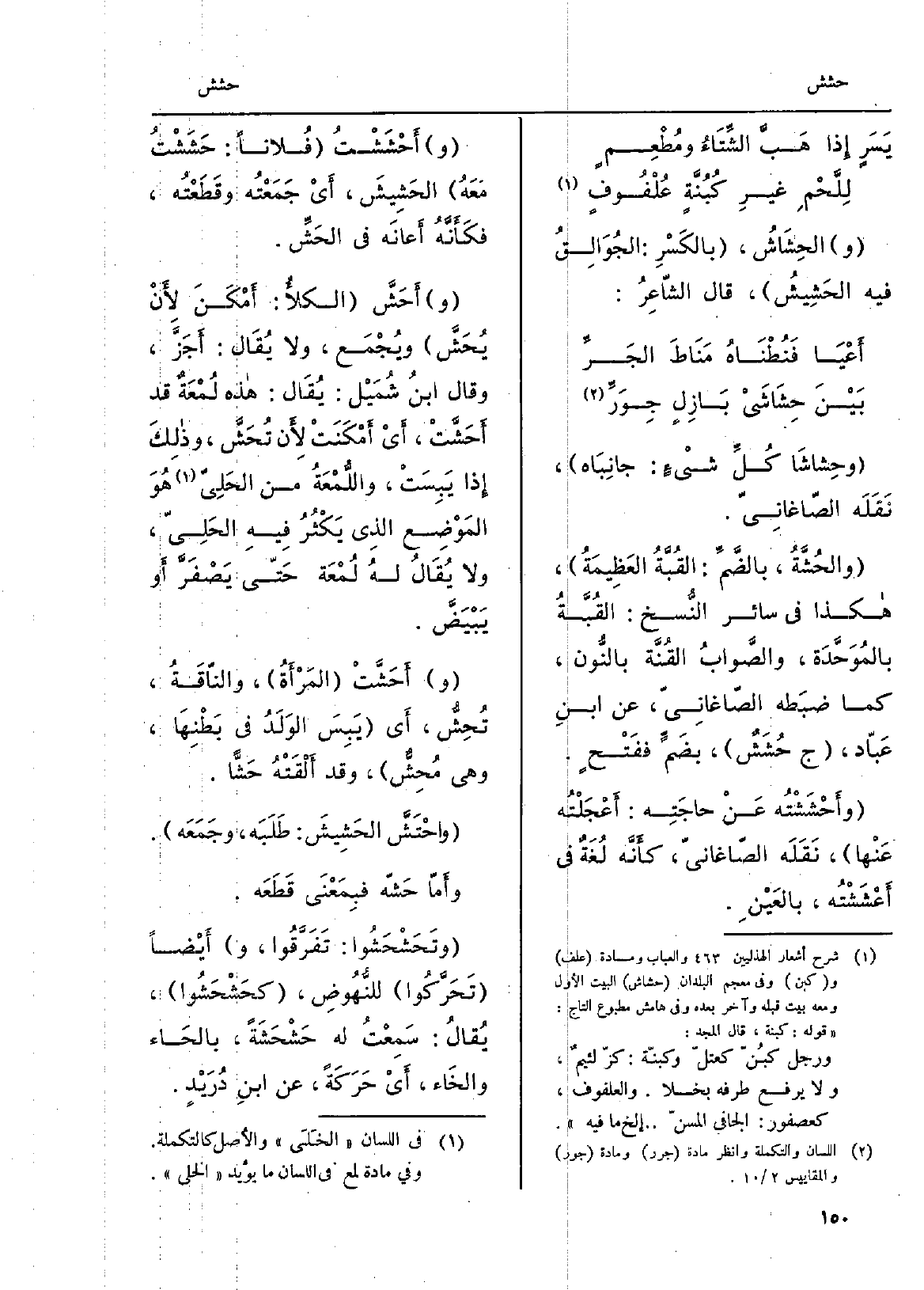 {وحِشاشَا كُلِّ شيْءٍ: جانِبَاه، نَقَلَه الصّاغانِيّ.} والحُشَّةُ، بالضَّمِّ: القُبَّةُ العَظِيمَةُ، هَكَذَا فِي سَائِر النُّسخ: القُبَّةُ بالمُوَحَّدَة، والصَّوابُ القُنَّة بالنُّون، كَمَا ضبَطه الصّاغانِيّ، عَن ابنِ عَبّاد، ج {حُشَشٌ، بضَمٍّ ففَتْحٍ. وأَحْشَشْتُه عنْ حاجَتِه: أَعْجَلْتُه عَنْها، نَقَلَه الصّاغانيّ، كأَنَّه لُغَةٌ فِي أَعْشَشْتُه، بالعَيْنِ. و} أَحْشَشْتُ فُلاناً: {حَشَشْتُ مَعَهُ} الحَشِيشَ، أَيْ جَمَعْتُه وقَطَعْتُه، فكَأَنَّهُ أَعانَه فِي {الحّشِّ.
