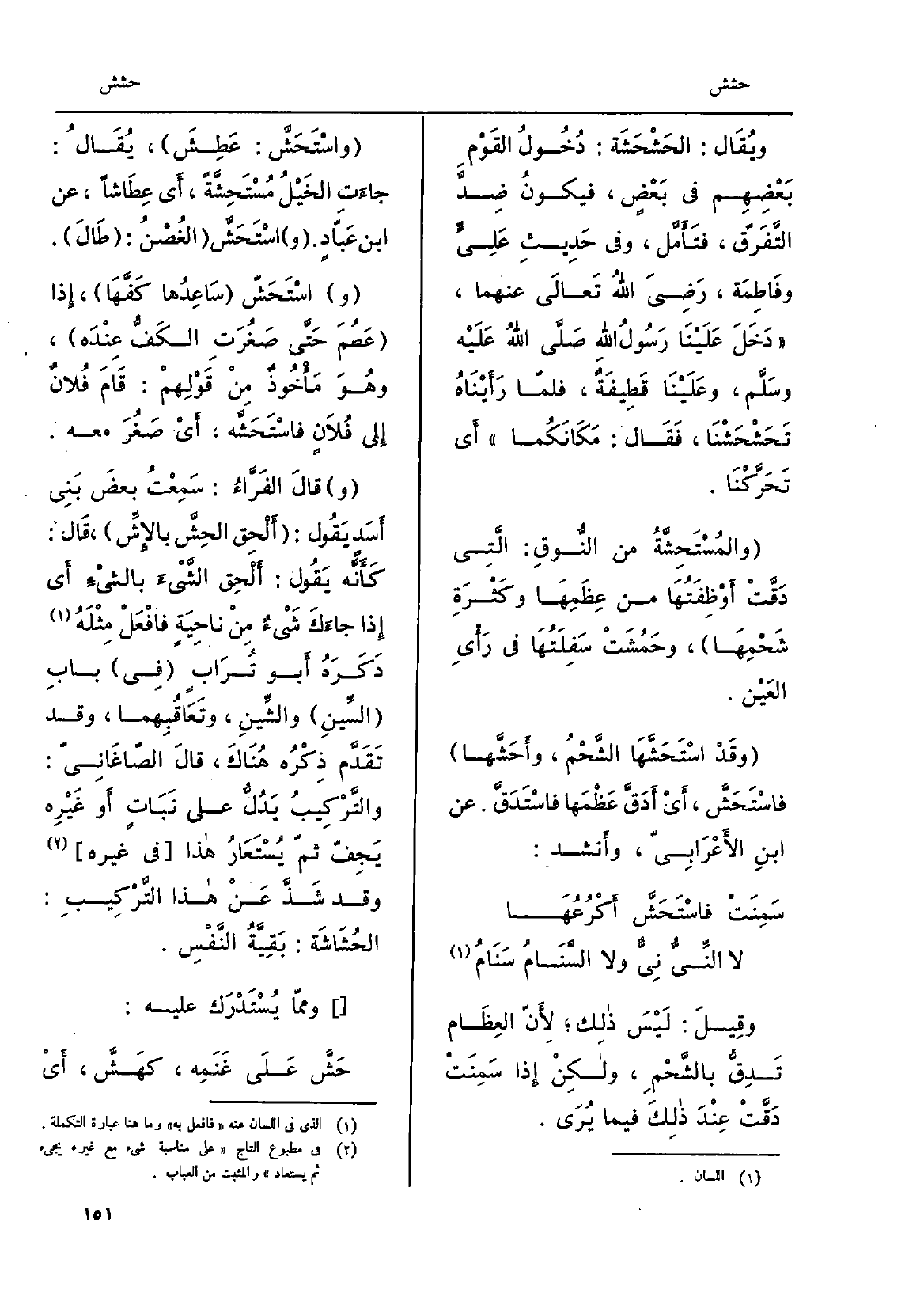 واسْتَحَشّ سَاعِدُها كَفَّهَا، إِذا عَصُمَ حَتَّى صَغُرَتِ الكَفُّ عِنْدَه، وهُوَ مَأْخُوذٌ مِنْ قَوْلِهمْ: قَامَ فُلانٌ إِلَى فُلاَنٍ {فاسْتَحَشَّه، أَيْ صَغُرَ مَعَه. وقالَ الفَرَّاءُ: سَمِعْتُ بعضَ بِنِي أَسَد يَقُول: أَلْحِق} الحِشَّ بالإِشِّ، قَال: كَأَنَّه يَقُول: أَلْحِق الشَّيْءَ بالشْيِء أَي إِذا جاءَكَ شَئٌ مِنْ نَاحِيَةٍ فافْعَلْ مِثْلَهُ ذَكَرَهُ أَبو تُرَابٍ فِي بابِ السِّينِ والشِّينِ وتَعَاقُبِهما، وَقد تَقَدَّم ذِكْرُه هُنَاكَ، قالَ الصّاغَانِيّ: والتَّرْكِيبُ يَدُلُّ على نَبَاتٍ أَو غَيْرِه يَجِفّ ثمّ يُسْتَعَارُ هَذَا فِي غَيره وَقد شَذَّ عَنْ هَذَا التَّرْكِيبِ: {الحُشَاشَة: بَقِيَّةُ النَّفْسِ. وممّا يُسْتَدْرَك عَلَيْهِ:} حَشَّ عَلَى غَنَمِه، كهَشَّ، أَي