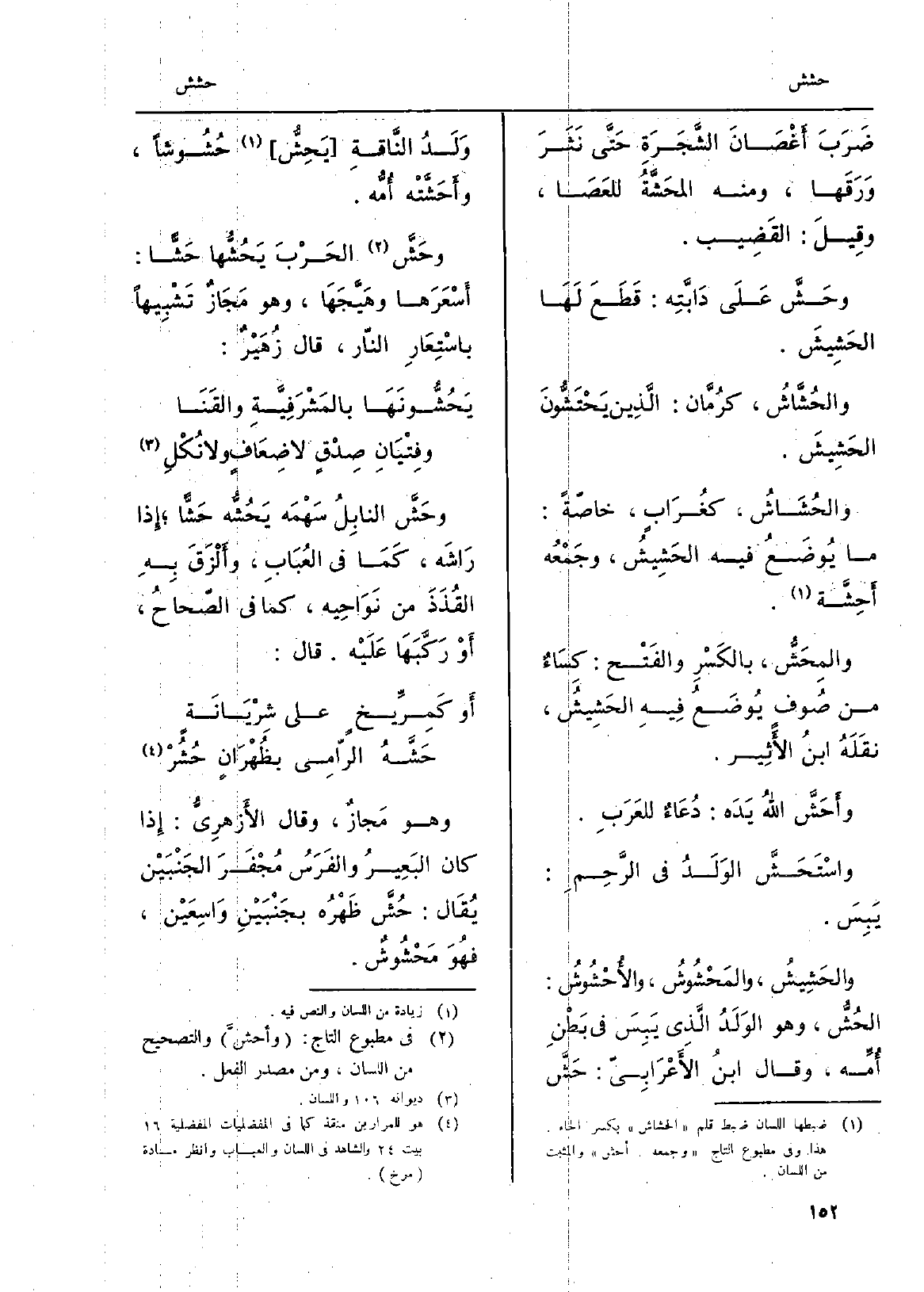 ْ ضَرَبَ أَغْصَانَ الشَّجَرَةِ حَتَّى نَثَرَ وَرَقَها، وَمِنْه {المَحَشَّةُ للعَصَا، وقِيلَ: القَضِيب.} وحَشَّ عَلَى دَابَّتِه: قَطَعَ لَهَا {الحَشِيشَ.} والحُشَّاشُ، كرُمَّان: الَّذِين {يَحْتَشُّونَ} الحَشِيشَ. {والحُشَاشُ، كغُرَابٍ، خاصّةً: مَا يُوضَعُ فِيهِ} الحَشِيشُ، وجَمْعُه {أَحِشَّه.} والمِحَشُّ، بالكَسْرِ والفَتْح: كِسَاءٌ من صُوف يُوضَعُ فِيهِ {الحَشِيشُ، نَقَلَهُ ابنُ الأَثِير.} وأَحَشَّ اللهُ يَدَه: دُعَاءٌ للعَرَبِ. {واسْتَحَشَّ الوَلَدُ فِي الرَّحِمِ: يَبِسَ.} والحَشِيشُ، {والمَحْشُوشُ،} والأُحْشُوشُ: {الحُشُّ، وَهُوَ الوَلَدُ الذَّي يَبِسَ فِي بَطْنِ أُمِّه، وَقَالَ ابنُ الأَعْرَابِيّ:} حَشَّ وَلَدُ النَّاقةِ {يَحِشُّ} حُشُوشاً، {وأَحَشَّتْه أُمُّه.} وحَشَّ الحَرْبَ {يَحُشُّها} حَشّاً: أَسْعَرَها وهَيَّجَهَا، وَهُوَ مَجَازٌ تَشْبِيهاً باسْتِعَارِ النّار، قَالَ زُهَيْرٌ: