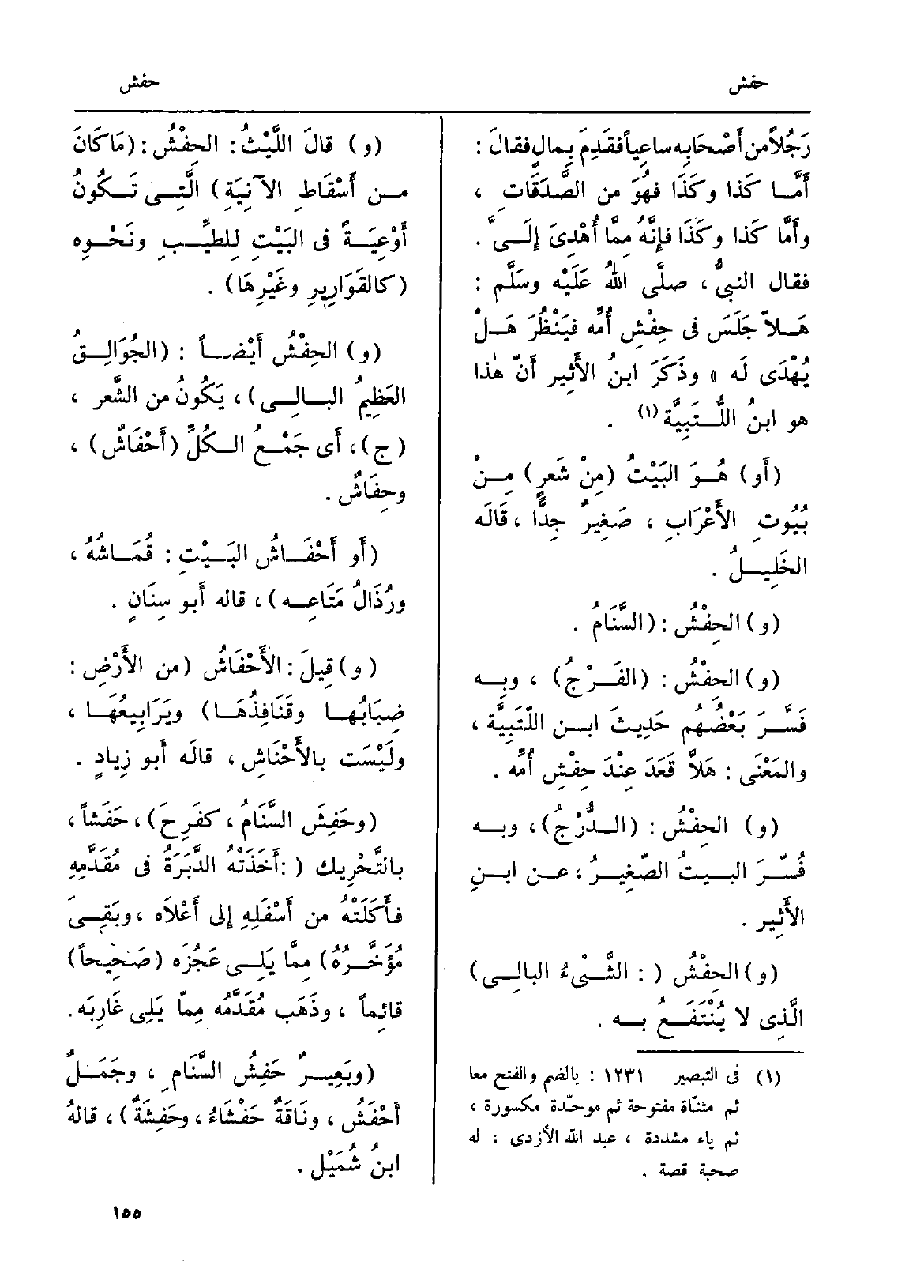 رَجُلاً من أَصْحَابِه ساعِياً فقَدِمَ بِمالٍ فقالَ: أَمَّا كَذا وكَذَا فهُوَ من الصَّدَقَاتِ، وأَمَّا كَذا وكَذا فإنَّهُ مِمَّا أُهْدِىَ إِلَيَّ. فَقَالَ النبيُّ، صلَّى اللهُ عَلَيْه وسَلَّم: هَلاّ جَلَسَ فِي حِفْشِ أُمِّه فيَنْظُرَ هَلْ يُهْدَى لَه وذَكَرَ ابنُ الأَثِير أَنّ هَذَا هُوَ ابنُ اللُّتَبِيَّة. أَو هُوَ البَيْتُ مِنْ شَعرٍ مِنْ بُيُوتِ الأَعْرَابِ، صَغِيرٌ جِدّاً، قَالَه الخَلِيلُ. والحِفْشُ: السَّنَامُ. والحِفْشُ: الفَرْجُ، وبِه فَسَّرَ بَعْضُهُم حَدِيثَ ابْن اللّتَبِيَّة، والمَعْنَى: هَلاَّ قَعَدَ عِنْدَ حِفْشِ أُمِّه. والحِفْشُ: الدُّرْجُ، وَبِه فُسّرَ البيتُ الصّغِيرُ، عَن ابنِ الأَثِير. والحِفْشُ: الشَّيْءُ البالِي الَّذِي لَا يُنْتَفَعُ بِهِ. وقالَ اللَّيْثُ: الحِفْشُ: مَا كَانَ من أَسْقَاطِ الآنيَةِ الَّتي تَكُونُ أَوْعِيَةً فِي البَيْتِ لِلِّطيبِ ونَحْوهِ كالقَوَارِيرِ وغَيْرِهَا. والحِفْشُ أَيْضاً: الجُوَالِقُ العَظِيمُ البالِي، يَكُونُ من الشَّعر، ج، أَي جَمْعُ الكُلِّ أَحْفَاشٌ، وحِفَاشٌ. أَو أَحْفَاشُ البَيْتِ: قُمَاشُهُ، ورُذَالُ مَتَاعِه، قَالَه أَبو سِنَانٍ. وقِيلَ: الأَحْفَاشُ من الأَرْضِ: ضِبَابُها وقَنَافِذُهَا ويَرَابِيُعَها، ولَيْسَت بالأَحْنَاشِ، قالَه أَبو زِيادٍ. وحَفِشَ السَّنَامُ، كفَرِحَ، حَفَشاً، بالتَّحْرِيك: أَخَذَتْهُ الدَّبَرَةُ فِي مُقَدَّمِهِ فأَكَلَتْهُ من أَسْفَلِهِ إِلَى أَعْلاَه، وبَقِيَ مُؤَخَّرُهُ مِمَّا يِلِي عَجُزَه صَحِيحاً قائِماً، وذَهَب مُقَدَّمُه مِمّا يَلِي غَارِبَه. وبَعِيرٌ حفَشُِالسَّنَامِ، وجَمَلٌ أَحْفَشُ، ونَاقَةٌ حَفْشَاءُ، وحَفِشَةٌ، قالهُ ابنُ شُمَيْل.
